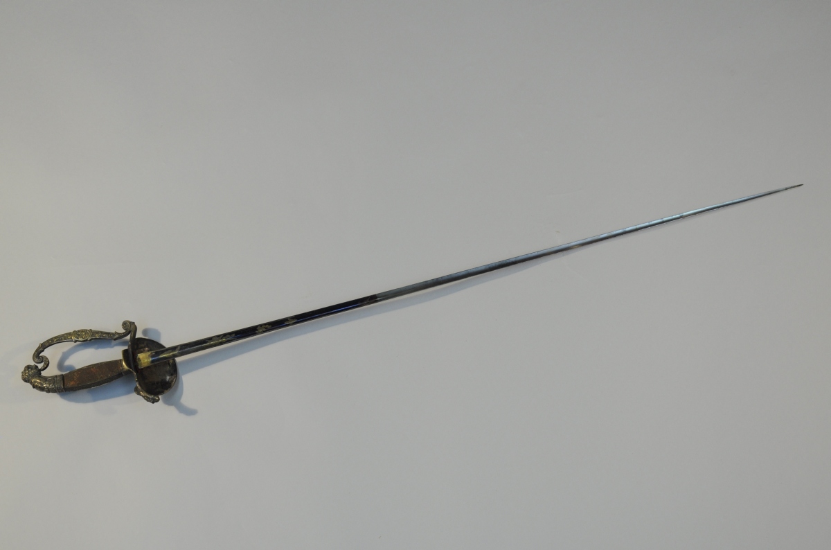 ÉPÉE D'OFFICIER, monture en laiton ciselé. Le clavier figurant une allégorie de la guerre. Fusée à plaquettes de nacre cannelées, pommeau en forme de crosse terminé par un mufle de lion. Lame triangulaire, bleuie et dorée au tiers. Signée au talon: "KS" (?).
