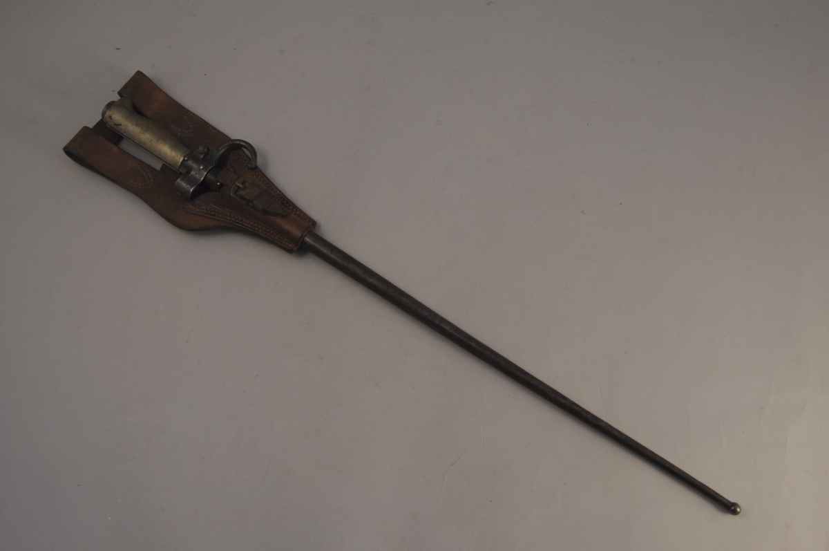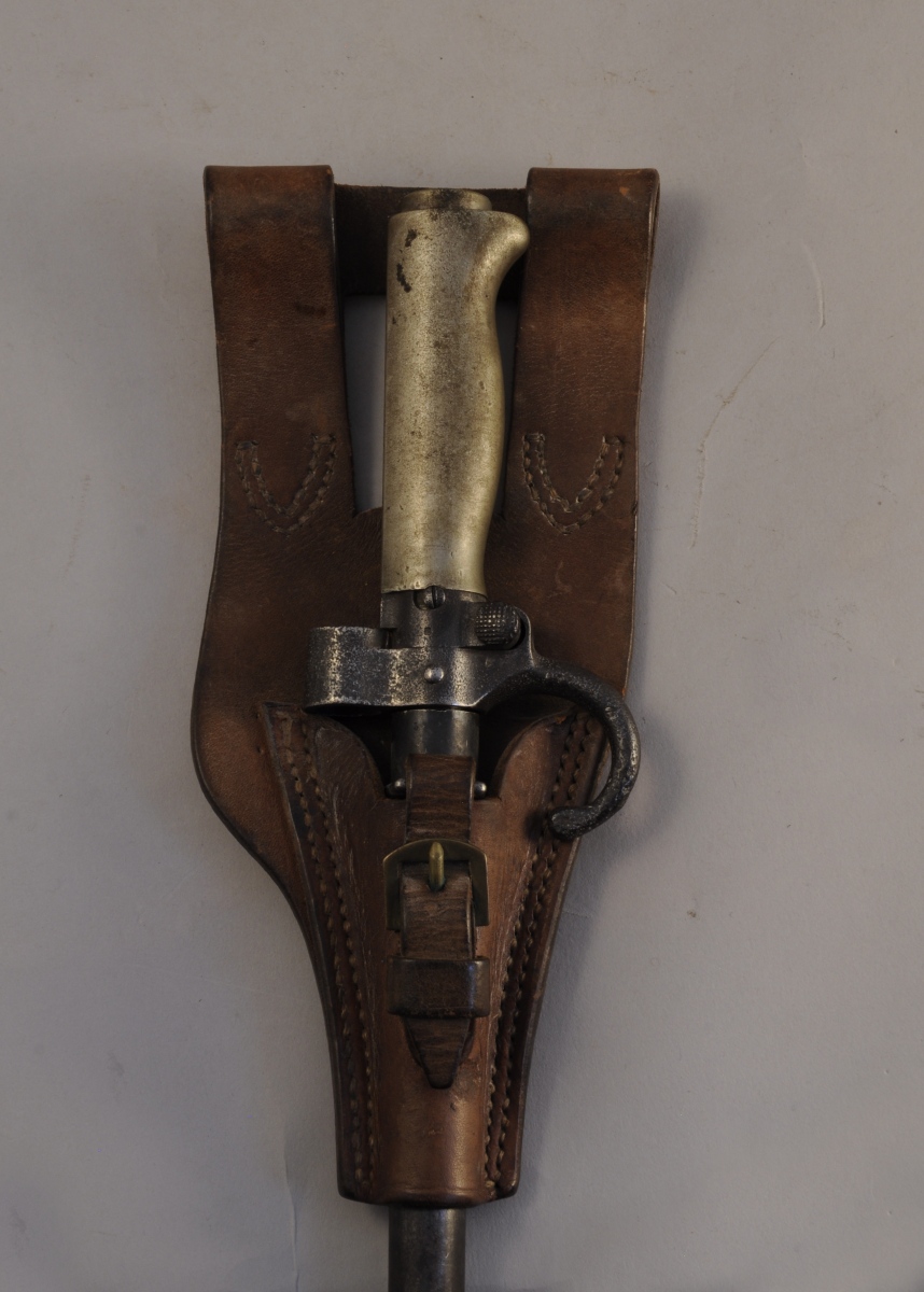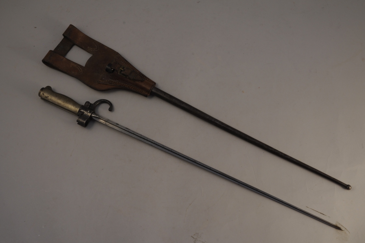 BAÏONNETTE LEBEL modèle 1886. Poignée en maillechort. Lame cruciforme. Fourreau en tôle de fer. Gousset en cuir. (usures)