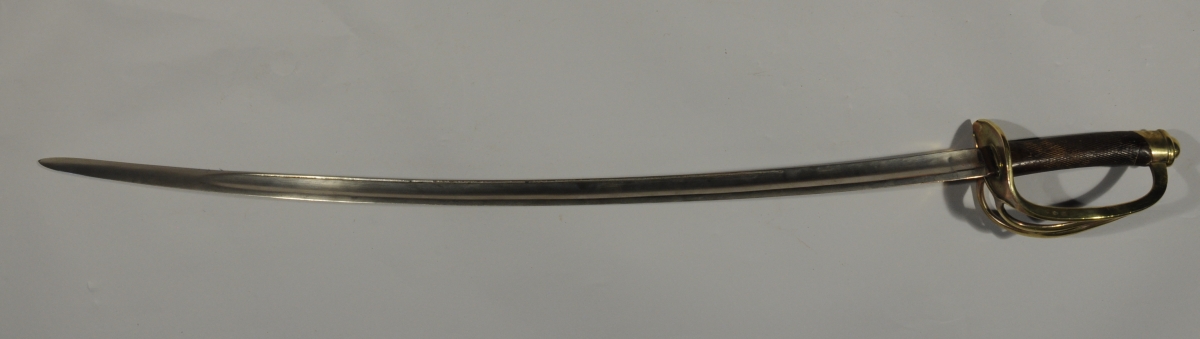 SABRE de cavalerie étranger, type 1822. Poignée en bois quadrillé. Monture en laiton, garde à trois branches poinçonné. Lame courbe à dos plat et pans creux.