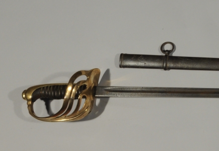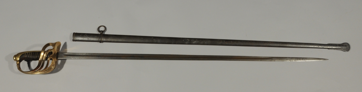ALLEMAGNE. SABRE d'officier d'infanterie de fantaisie. Poignée en corne avec filigrane. Monture en laiton, garde à branches multiples. Lame droite à dos plat et pans creux (oxydations). Fourreau en tôle de fer à un bracelet.
