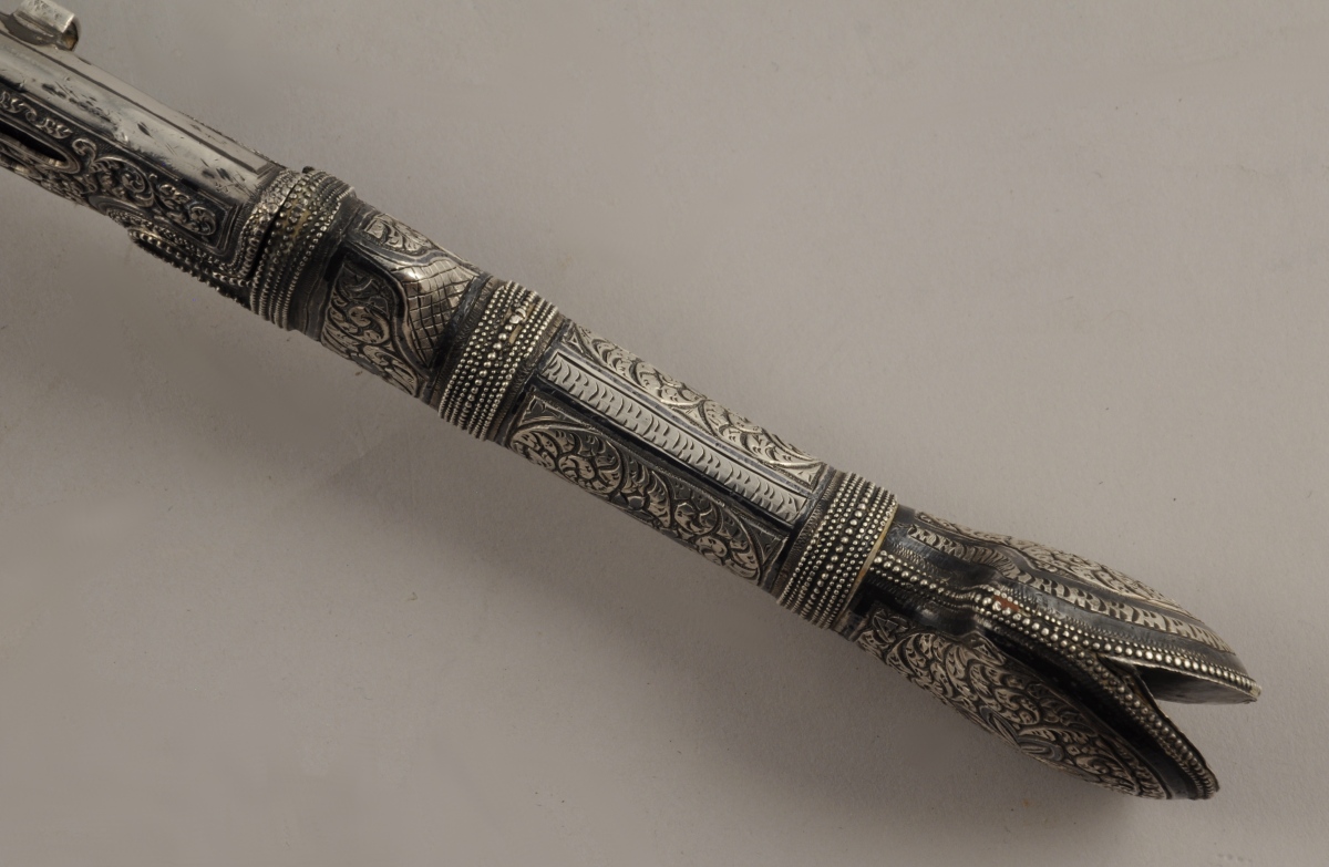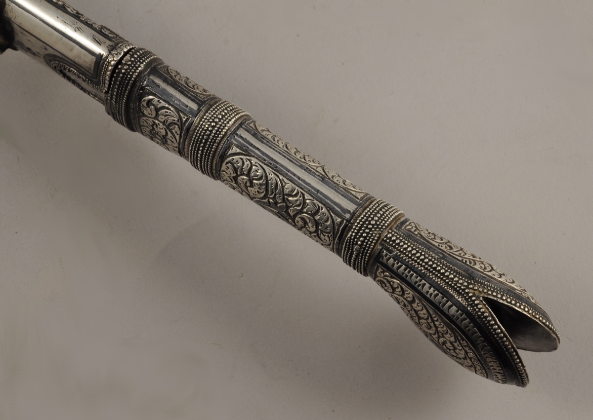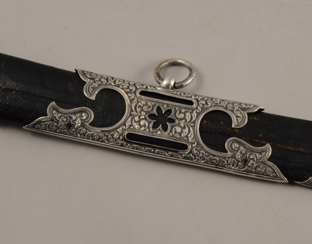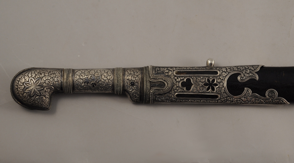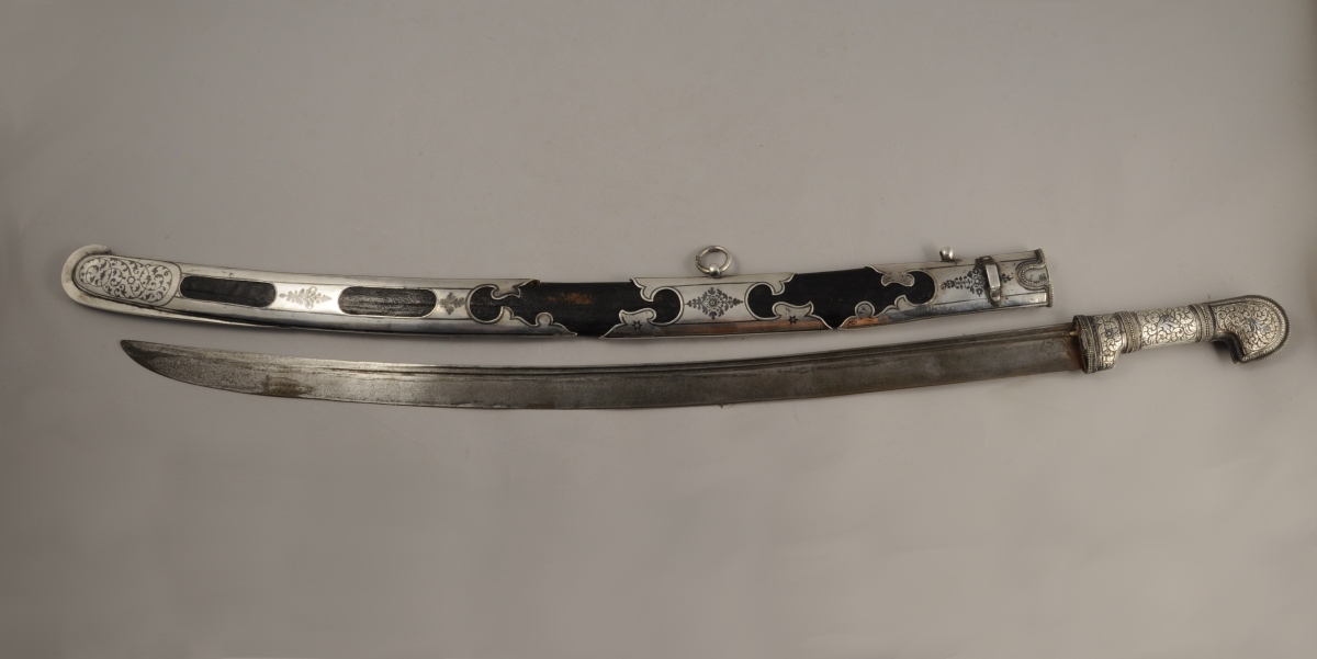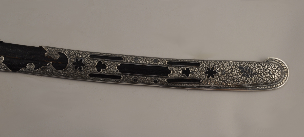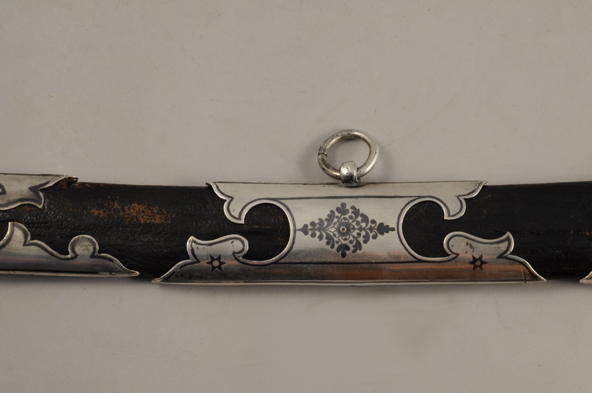 Poignée recouverte d'argent repoussé à décor de feuillages et de frises perlées. Monture à deux demi oreillons (manque un). Lame courbe à gouttières, poinçonnée au talon. Fourreau recouvert de chagrin, entièrement recouvert d'argent découpé et niellé, travaillé à jours Avers repoussé de rinceaux feuillagés, à décor d'étoile ajourée. Revers uni à décor niellé de filets et bouquets. Un des emplacements des demi oreillons est gravé " P.Sh " en cyrillique.