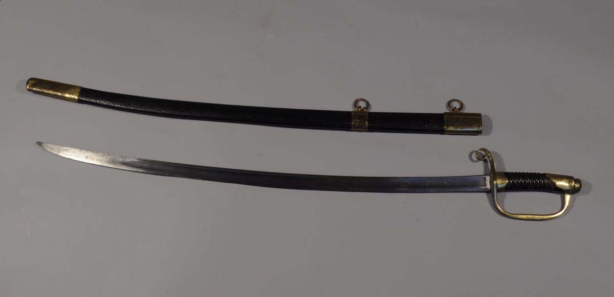 RUSSIE. SABRE DE CAVALERIE LÉGÈRE. Poignée en corne. Monture en laiton, garde à une branche. Lame courbe à dos plat et pans creux, poinçonnée au talon. Fourreau postérieur à deux garnitures en laiton.