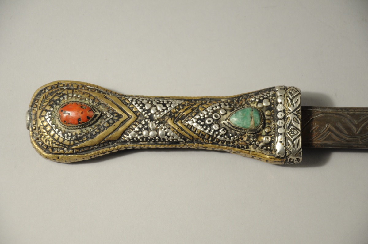 GRAND-SUD MAROCAIN. DAGUE en argent et laiton rehaussé de pierres semi-précieuse en cabochons. Fourreau à bagues, denticules et arabesques. Lame en métal à guirlandes stylisées.