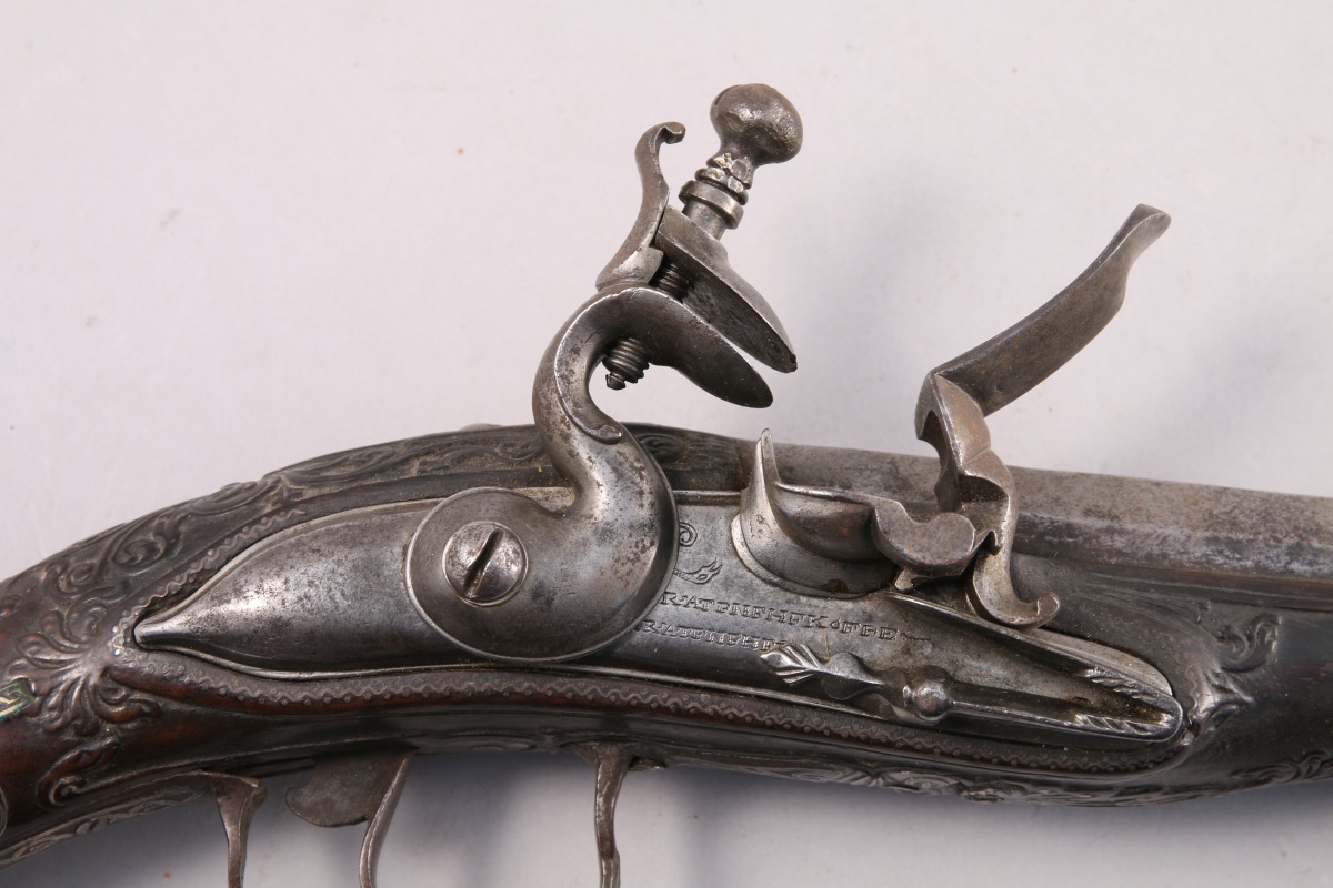 Canons ronds à pans aux tonnerres, poinçonnés. Platines signées et chiens col de cygne à corps ronds. Garnitures en argent gravé, ciselé, à décor repoussé de fleurs et de végétaux. Montures à longs fûts en noyer sculpté. Crosses joliment incrustées de fils et de plaques d'argent.