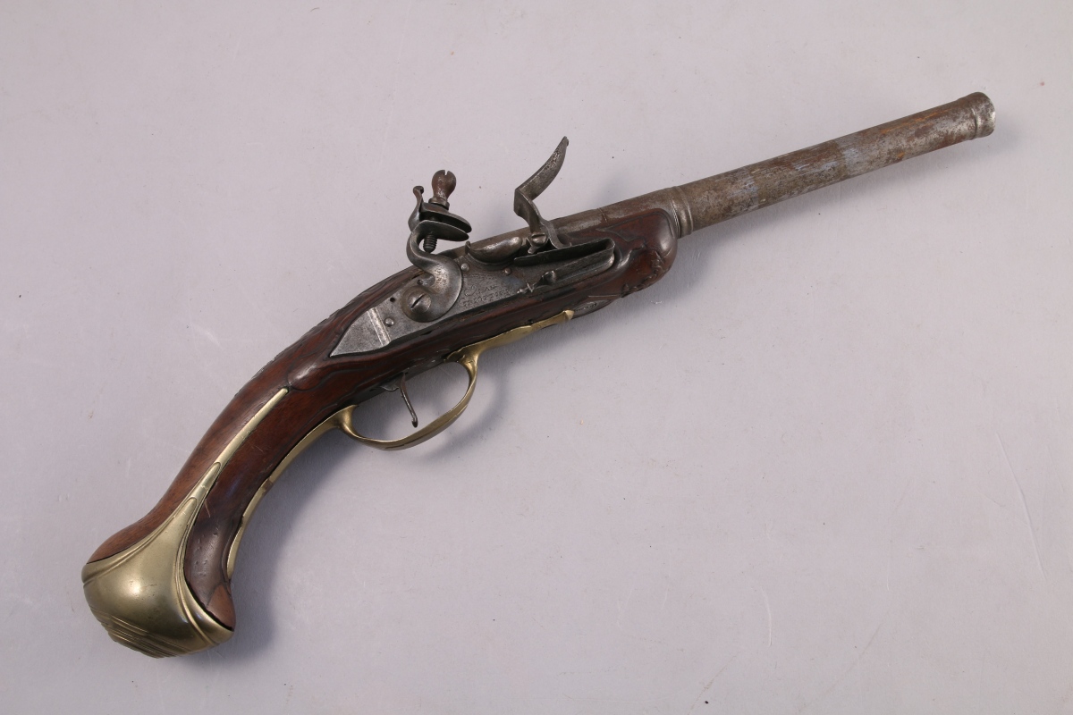 Canon rond à pans au tonnerre. Platine à corps plat gravée " Jean Griottier ". Chien col de cygne à corps rond. Garnitures en laiton. Crosse en noyer en partie sculpté, avec pièce de pouce en argent, armoiries sous couronne de comte.
