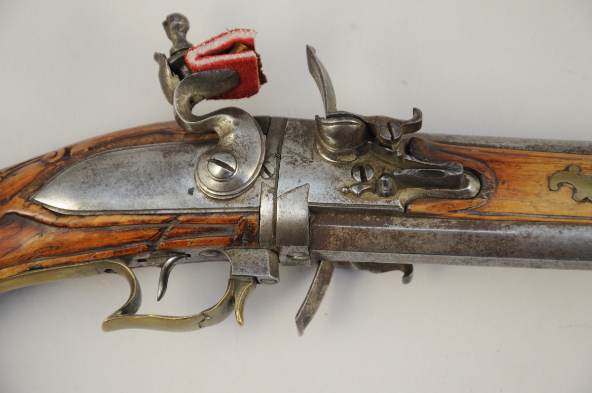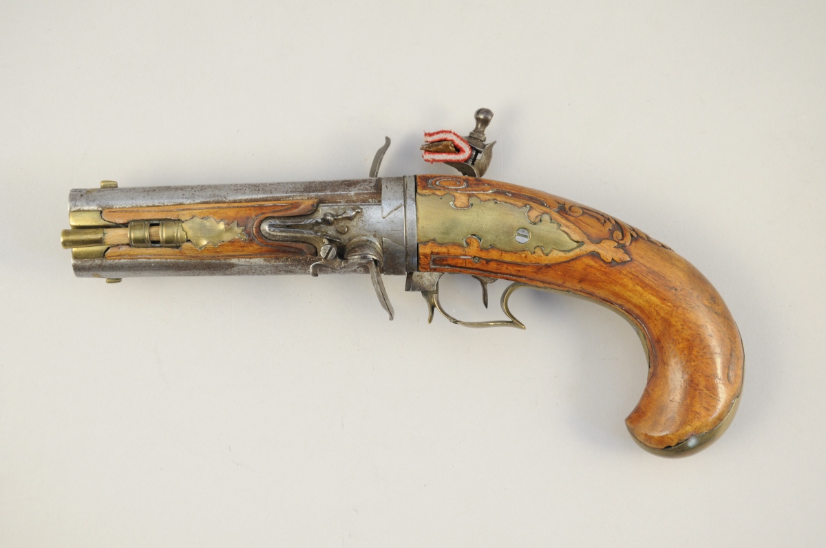 AUTRICHE ou ALLEMAGNE. PISTOLET À SILEX à deux canons surperposés tournants (raccourcis), un seul chien.