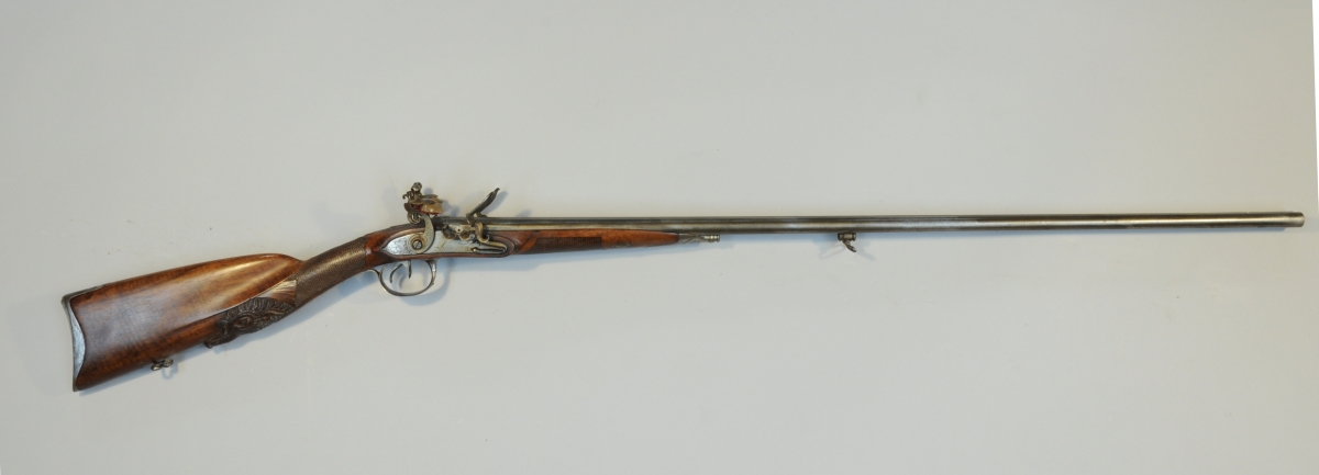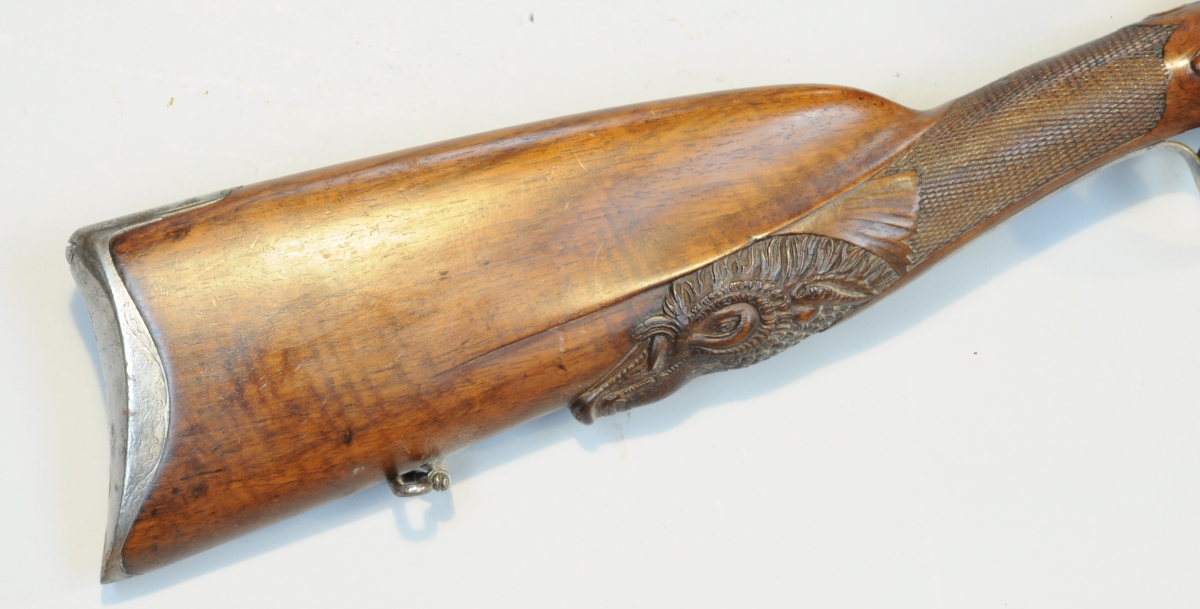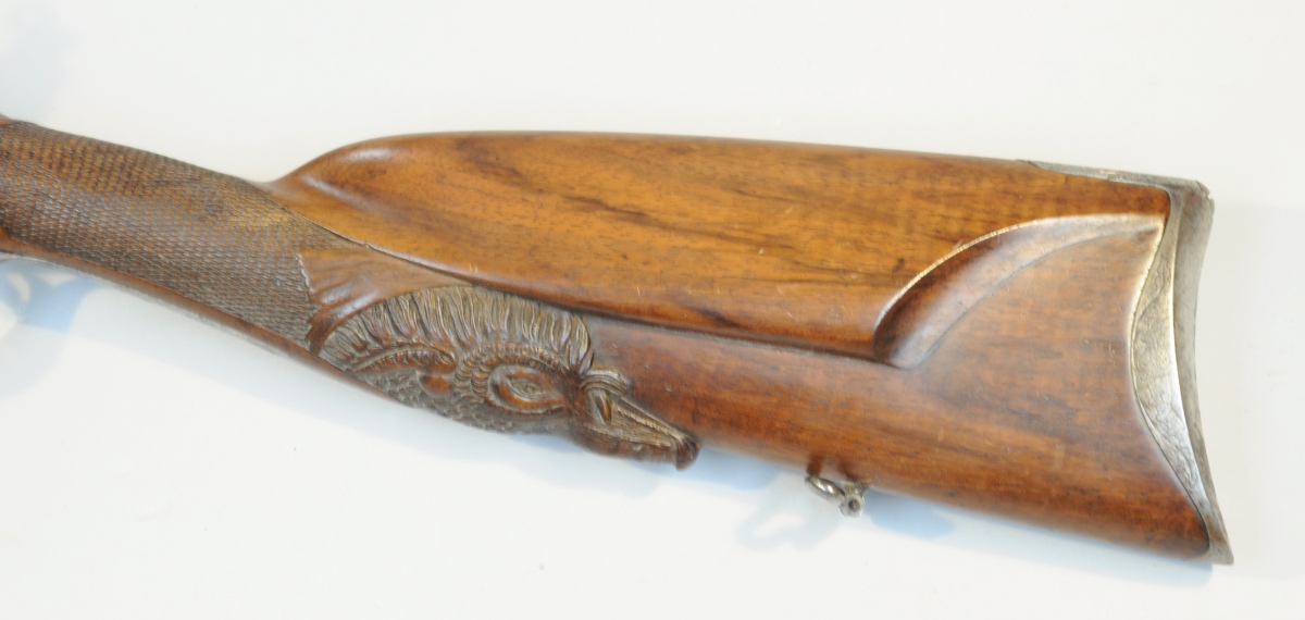 FUSIL DE CHASSE À SILEX, deux coups à canons juxtaposés. Platines signées "Lemonnier / à Vire", chacune gravée d'un chien. Crosse à joue finement sculptée d'une hure de sanglier.