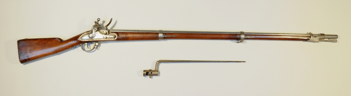 FUSIL à silex 1777 An IX et baïonnette. Platine Manuf Roy de St Etienne. Garnitures en fer. Cachet de crosse à la fleur de lys.