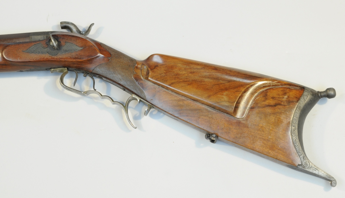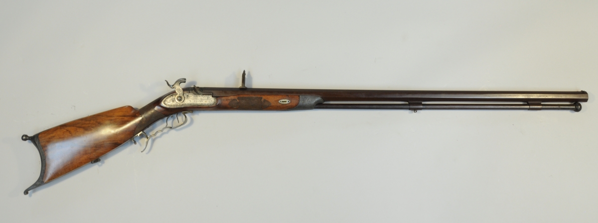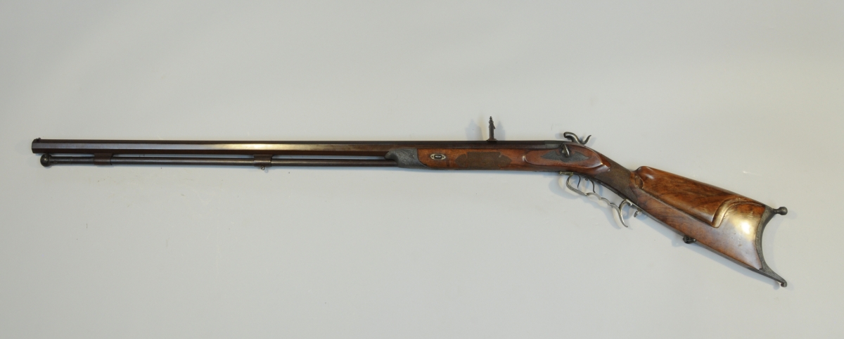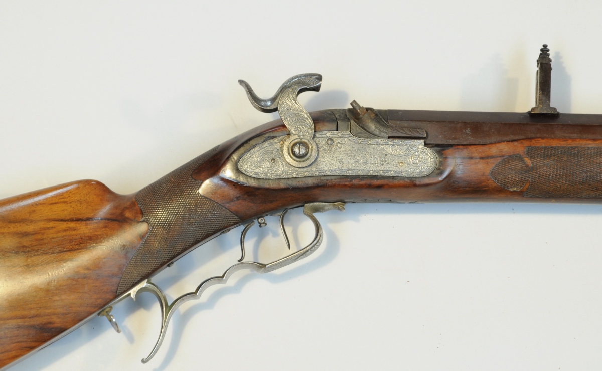 CARABINE DE CHASSE à percussion, un coup a double détente réglable. Canon octogonal signé "J.F. Dennle" (?) et platine gravée "à Aidau" (?). Crosse en noyer, à joue. Plaque de couche à croc.