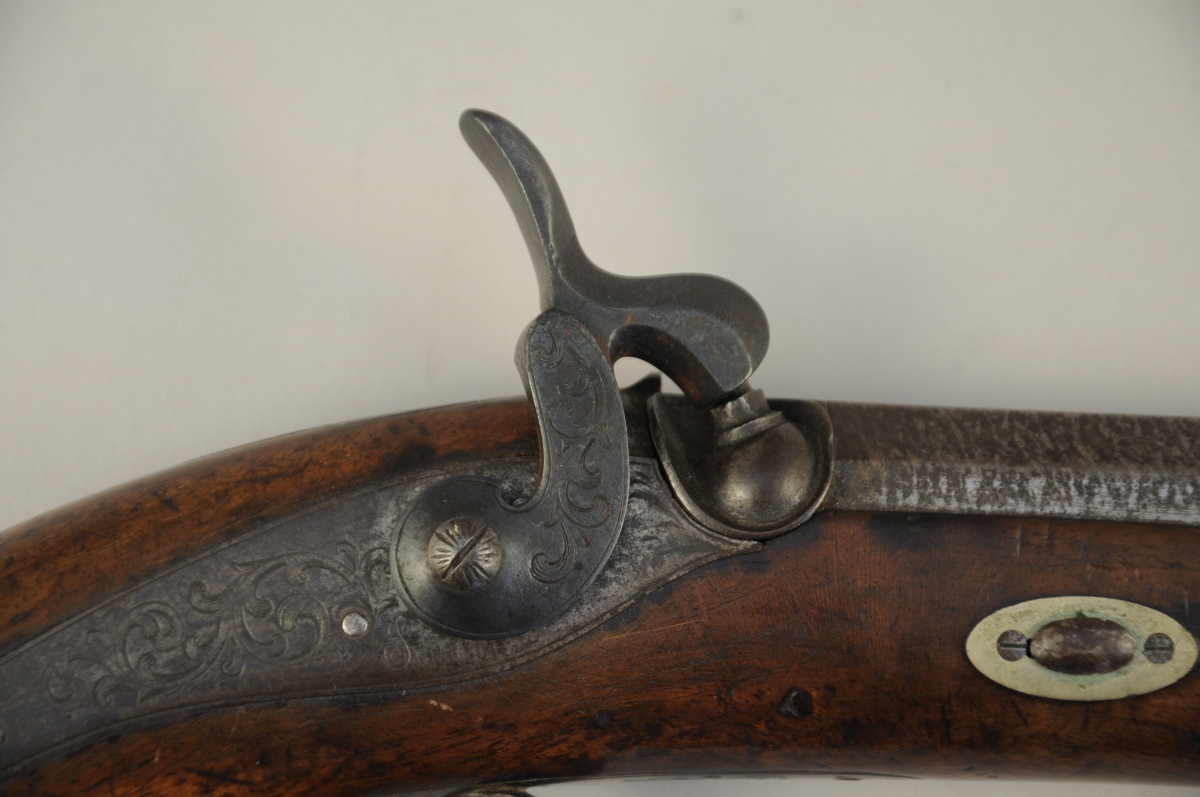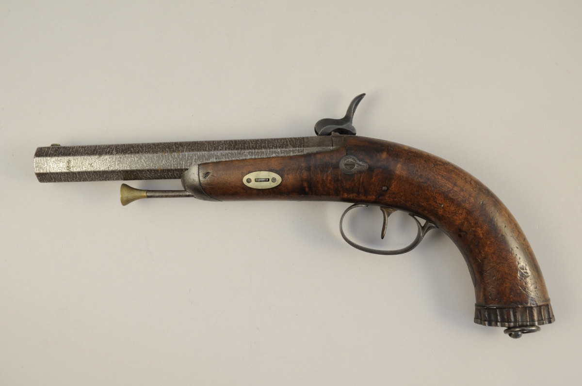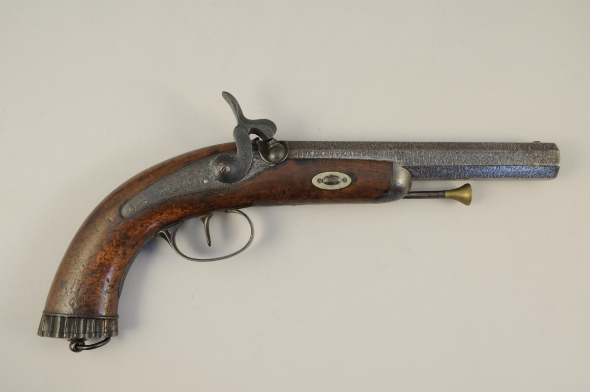 PISTOLET à percussion. Canon à pans, ruban damas. Crosse en noyer.