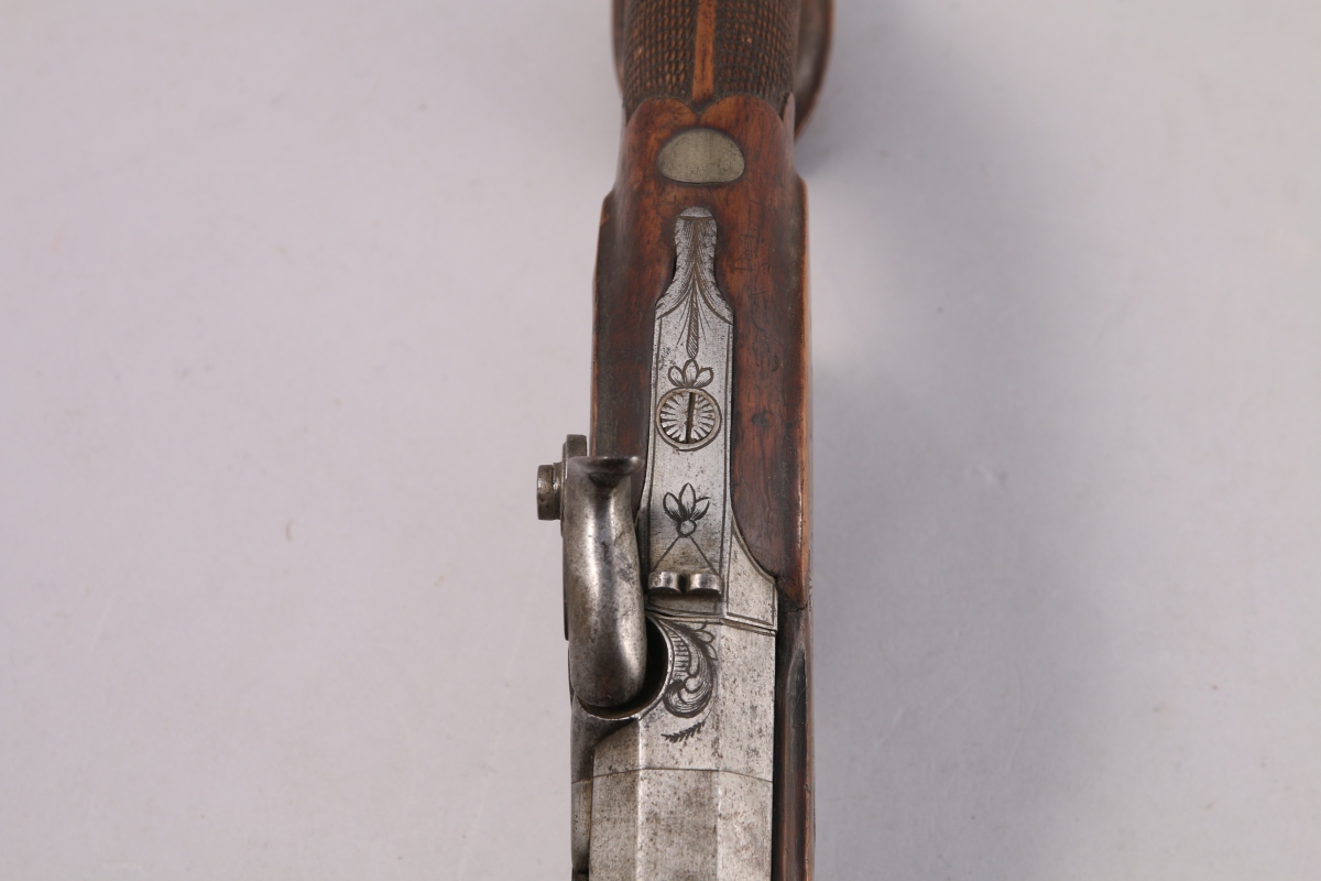Canons à pans ruban, damas, à rayures cheveux. Queues de culasse, platines avant et chiens à corps plats gravés. Garnitures en fer découpé, gravées en suite. Pontets repose doigt. Crosses en noyer finement quadrillé avec pièces de pouce en argent. Baguettes en fer.