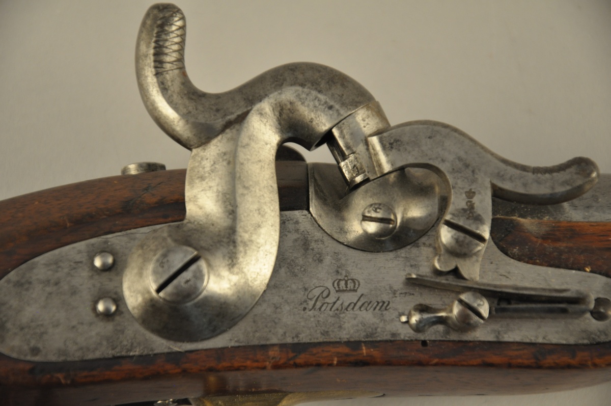PRUSSE. PISTOLET DE CAVALERIE À PERCUSSION, MODÈLE 1851, canon rond à pans au tonnerre daté 1852.1866. Crosse en noyer poinçonnée. Garnitures en laiton poinçonnées, anneau de calotte en fer, le pontet matriculé: "U.R.13.2.E.86.". La platine signée "Potsdam" surmonté de la couronne impériale. Bel état.