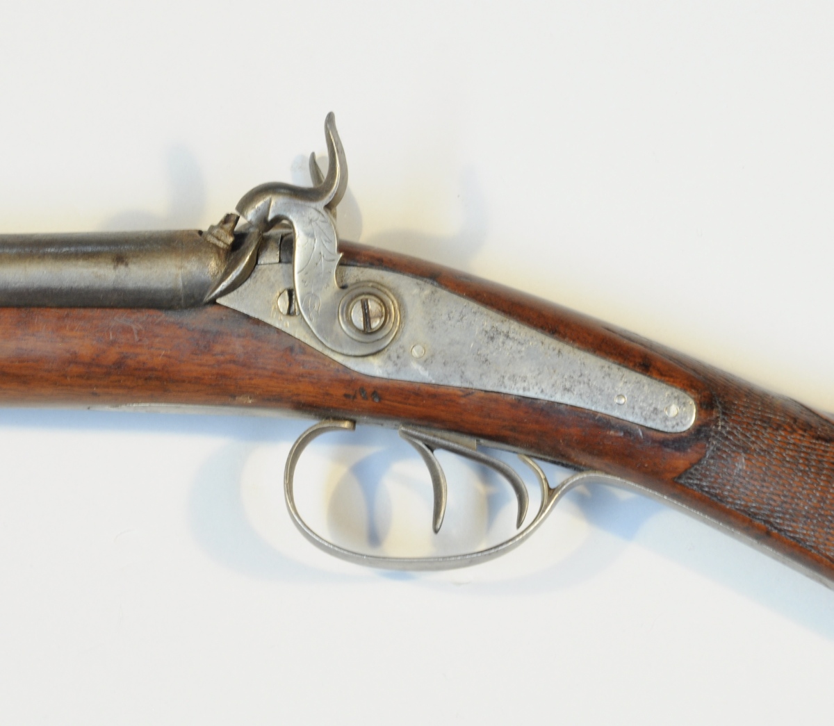 FUSIL DE CHASSE à percussion, deux coups à canons en table. Crosse en noyer sculptée d'une hure de sanglier.