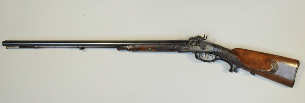 FUSIL DE CHASSE à percussion système à consoles KREISSER à Leipzig, deux coups. Calibre12. Canons en table. Crosse en noyer finement sculptée de croisillons et d'une tête monstrueuse aux yeux incrustés de nacre. Canons et platines signés. Pontet en corne. Crosse à décor quadrillé de losanges, enrichi de pointes d'argent aux angles