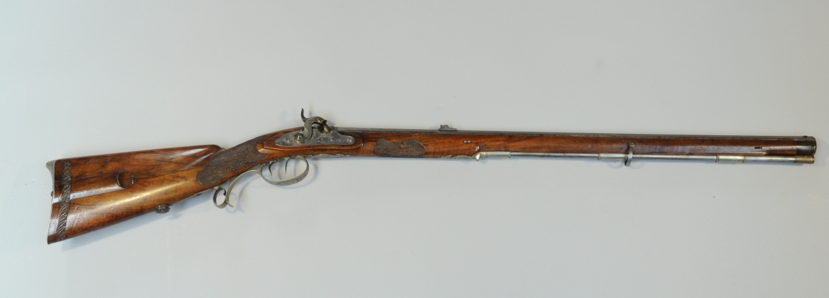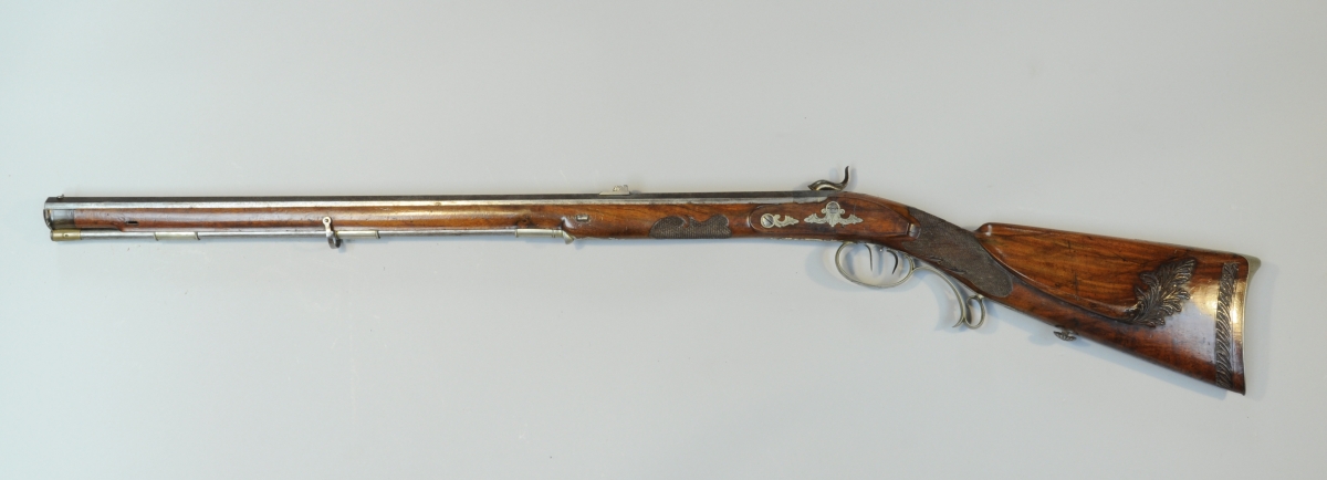 CARABINE DE CHASSE M. HIMER à silex transformé à percussion, un coup à double détente réglable Stecher. Canon faux damas octogonal signé "M. Himer in Lauban". Crosse sculptée d'acanthe munie d'un patch box pour capsules.