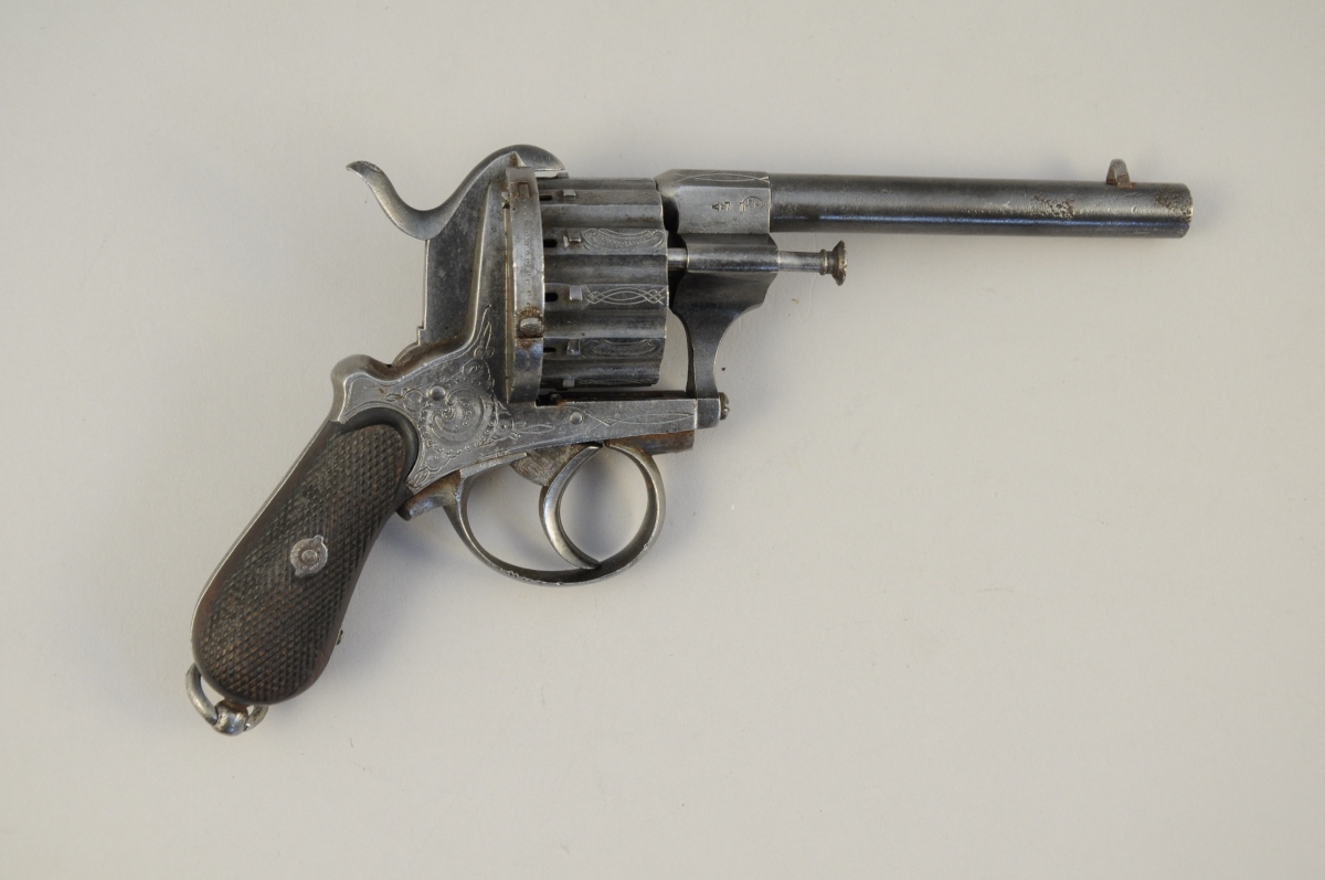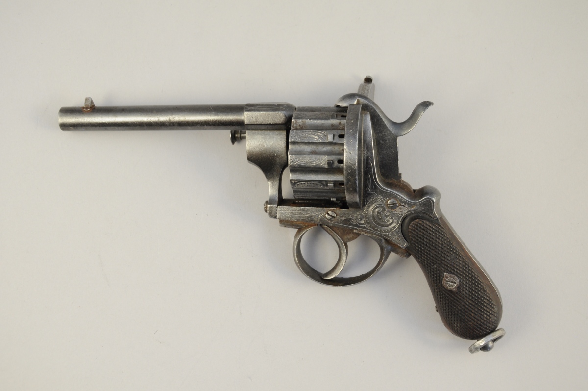 REVOLVER type Lefaucheux, système Chaineux (12 coups), calibre 7 mm. Canon rond, à pans au tonnerre. Barillet cannelé. Plaquettes de crosse en noyer quadrillé.