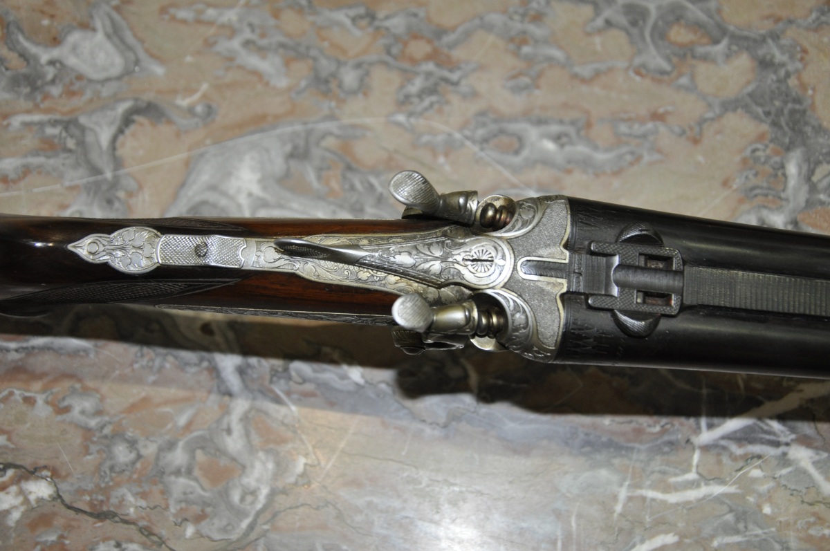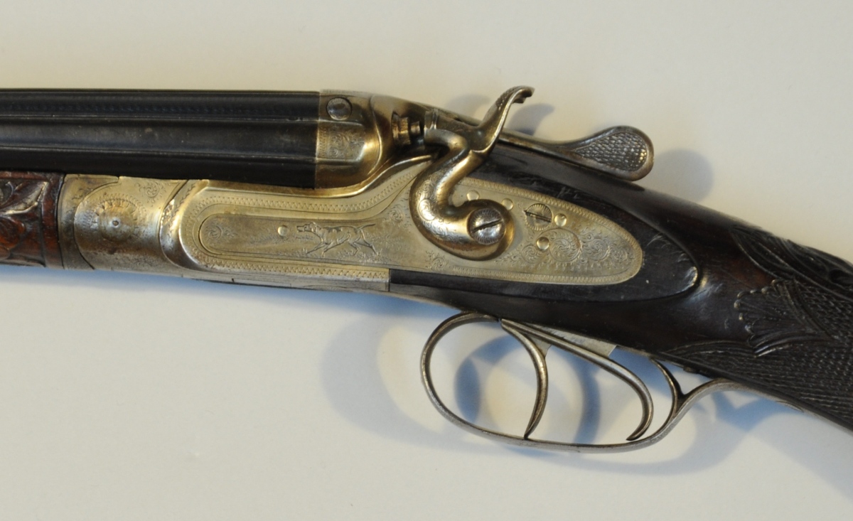 Canons juxtaposés marqués à l'or. Belle crosse en noyer sculpté de rinceaux feuillagés.