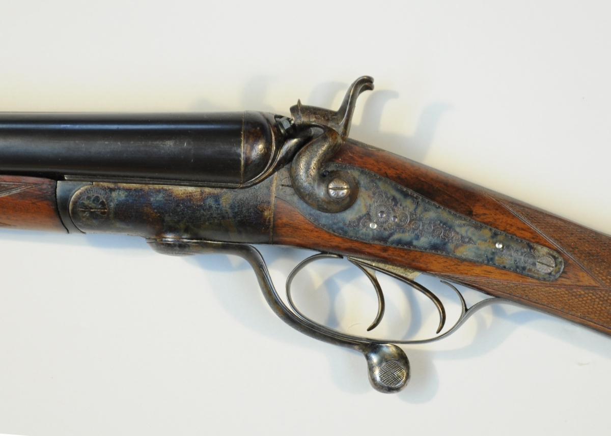 FUSIL DE CHASSE à percussion centrale, chiens extérieurs, HOLLAND-HOLLAND deux coups, calibre12. Canons juxtaposés (intérieur piqué). Platines arrières jaspées. Ouverture par clé sous pontet. Crosse en noyer.
