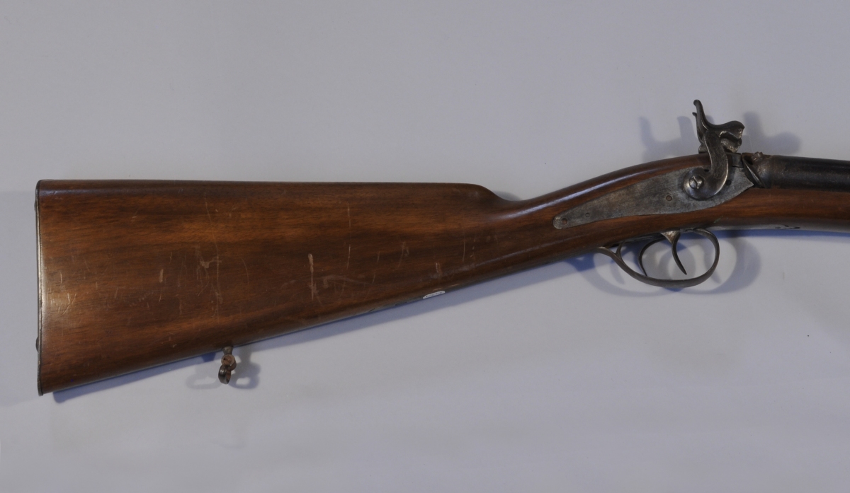 FUSIL DE CHASSE à percussion, deux coups à canons juxtaposés. Canons à l'imitation du damas. Crosse en noyer. Baguette.