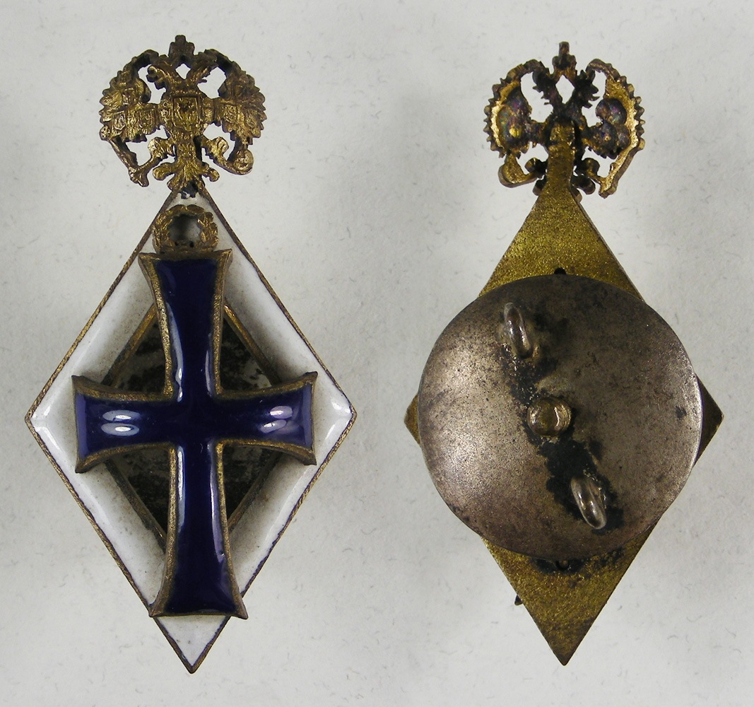 Russie - INSIGNE de bachelier en bronze doré et émail, fixation par vis et écrou, sans signature de fabricant.