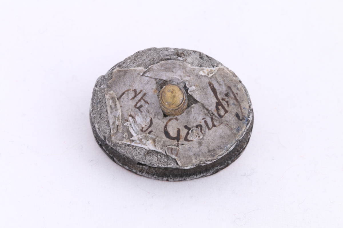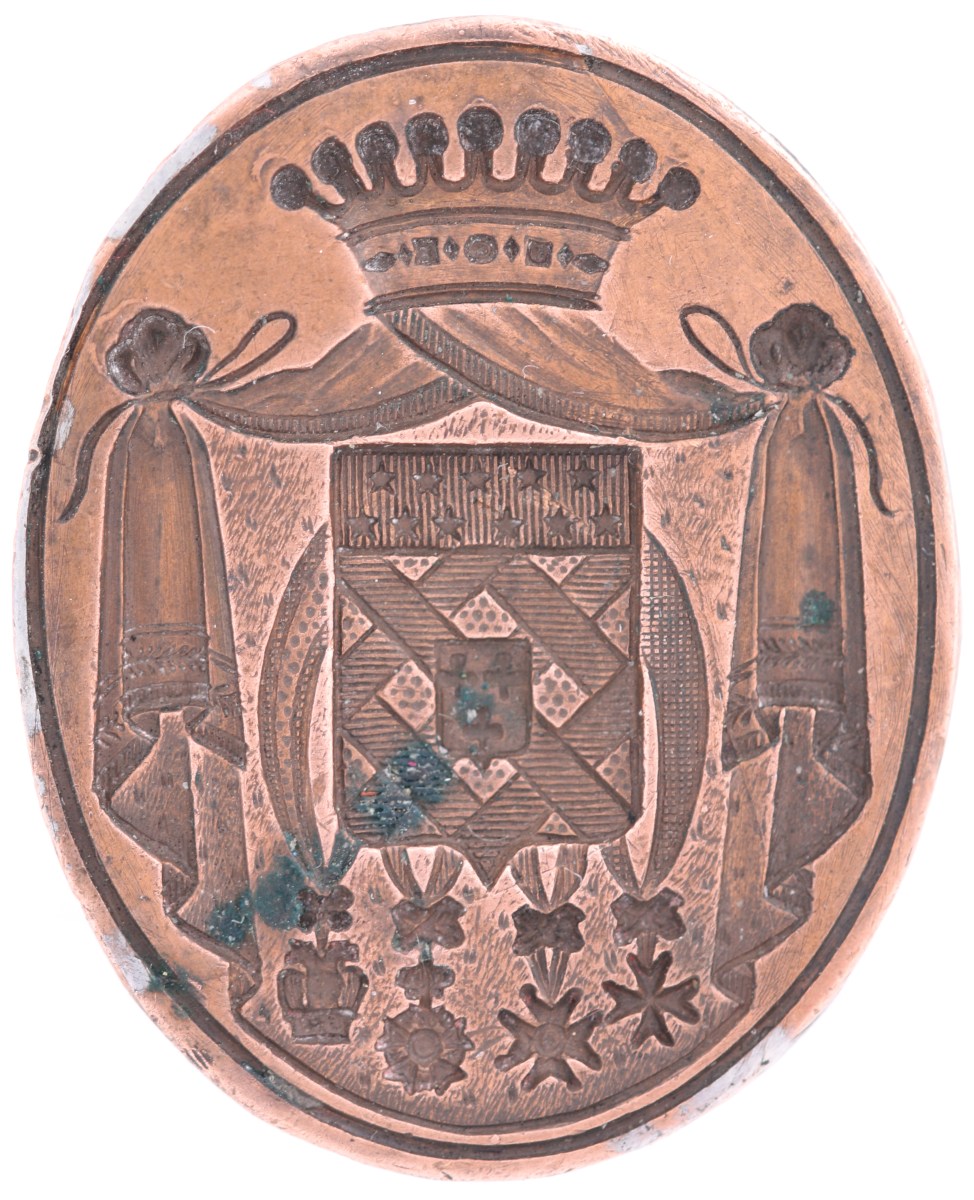 PROJET DE SCEAU pour le MARÉCHAL GROUCHY de forme ovale. Galvanoplastie en cuivre fixée dans une gangue de plomb. Le revers porte une ancienne inscription manuscrite à l'encre: " Cte de Grouchy ". Écu aux armes du maréchal Émmanuel de Grouchy (1766-1847): d'or, fretté d'azur ; à l'écusson d'argent chargé de trois trèfles de sinople ; au chef brochant des ducs d'Empire qui est de gueules, semé d'étoiles d'argent. Manteau frangé, doublé d'hermine et timbré d'une couronne comtale.