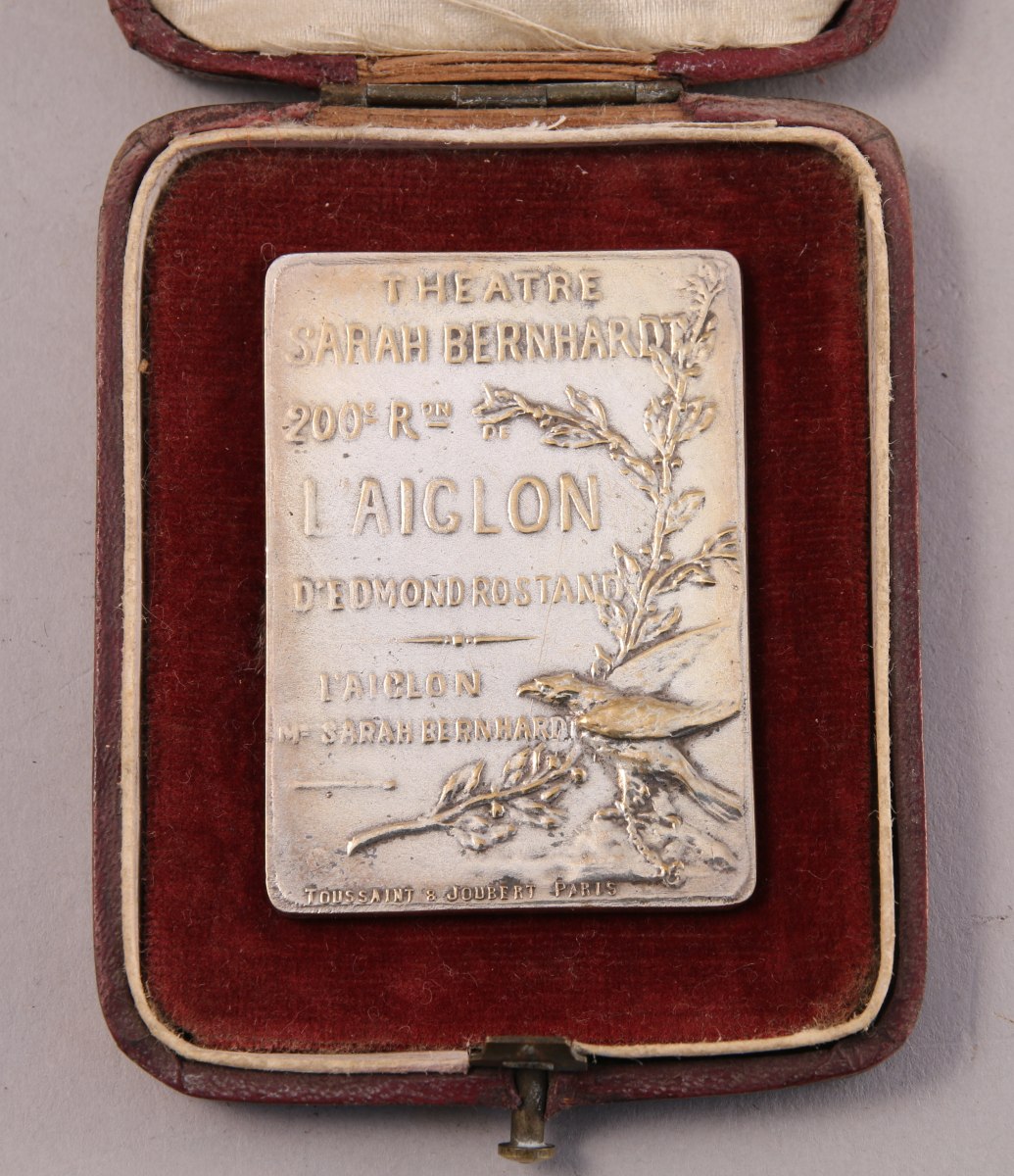 L'AIGLON. Plaque souvenir en métal argenté de la 200e représentation de la pièce d'Edmon Rostand jouée par Sarah Bernhardt au théâtre Sarah Bernhardt. Éditée par Toussaint et Joubert à Paris. Écrin.