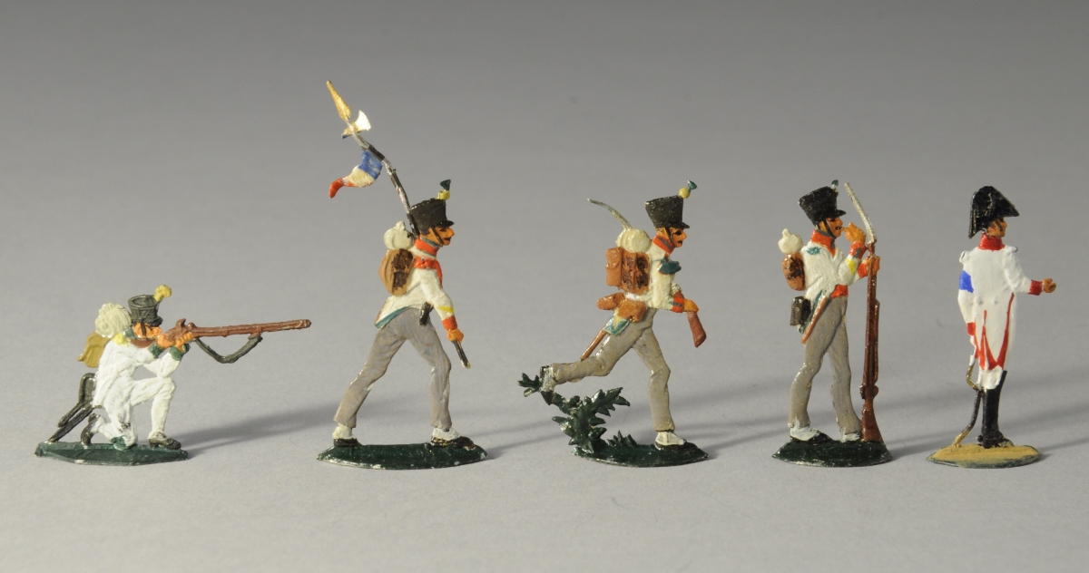 SOLDATS de PLOMB peints à la main. 16 pièces. Un régiment de 9 pièces à uniforme blanc, gris et rouge (dont un officier et un porte drapeau). 7 soldats en position de tir à uniforme blanc, vert et jaune.
