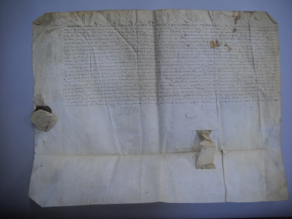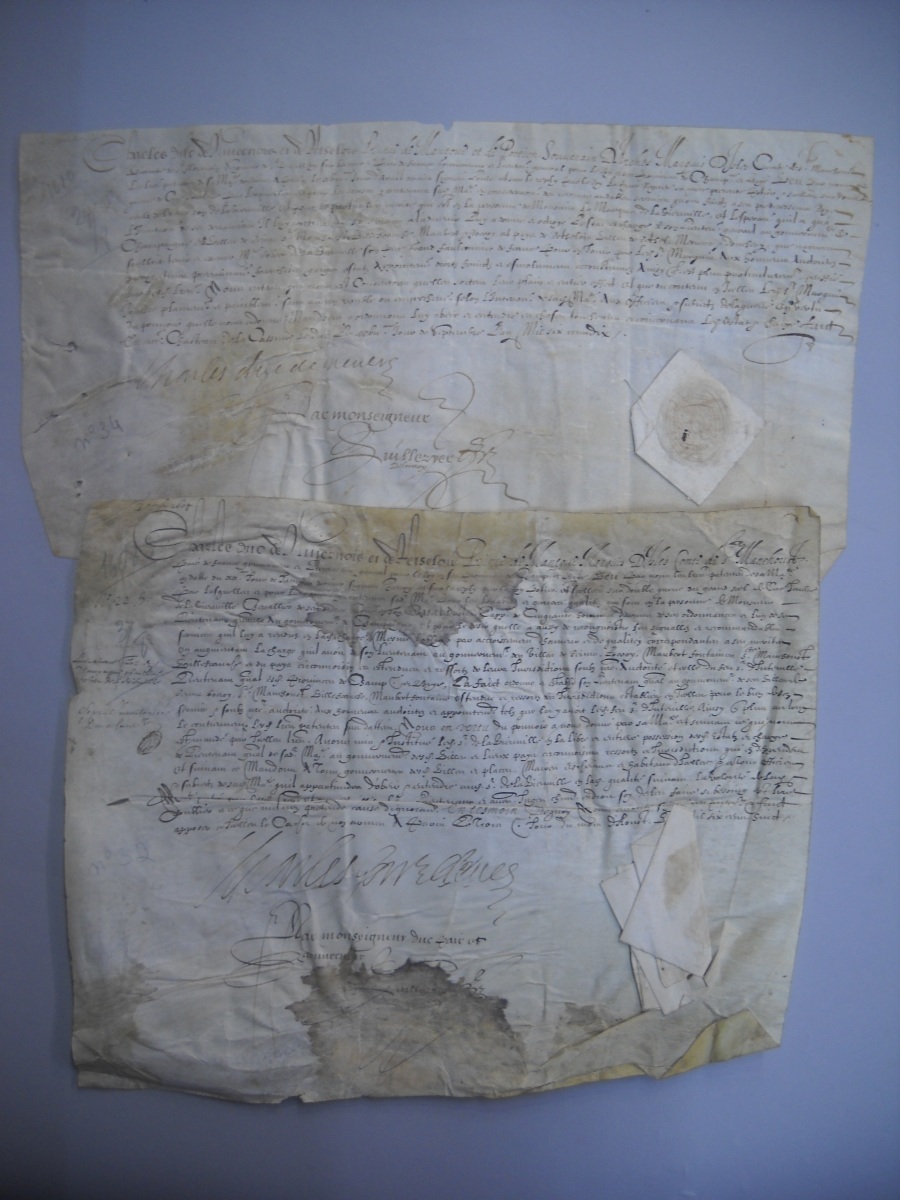 ". - P.S., Paris, 20 janvier 1608, signée " Henry " [Henri IV, roi de France (1553-1610)] et contresignée par le secrétaire d'état [Louis] Potier, vélin obl. in-fol. Plié. Provisions de lieutenant-général au gouvernement de Reims, Rocroy, Sainte Menéhould, Villefranche et Mauberfontaines, délivrée à Robert de la Vieuville. - P.S., Paris, 3 août 1608, par Charles Ier Gonzague, duc de Nevers et prince de Mantoue (1580-1637), vélin obl. Confirmation de la charge de lieutenant-général en Champagne délivré à Robert de la Vieuville. - 6 pièces papier, reconnaissance de la dite charge par les villes du bailliage, 1609 - P.S., Paris, 26 juin 1610, par Robert de la Vieuville, vélin in-8. Procuration donnée par Robert de la Vieuville pour la résignation en faveur de Charles son fils aîné de la charge de lieutenant général en pays et duché de Rethélois. - P.S., Paris, 18 août 1610, signée " Louis " " [Louis XIII roi de France (1601-1643)] et contresignée par le secrétaire d'état [Louis] Potier [de Gesvres], vélin obl. in-fol. plié, reste de sceau de cire rouge. Provisions de lieutenant général au gouvernement du duché de Rethélois et enclaves en faveur de Charles de la Vieuville sur résignation de son père en date du 13 août, en présence de la reine mère Régente. + enregistrement à la chambre du parlement - P.S., château de la Cassine, 27 septembre 1610, par Charles Ier Gonzague, duc de Nevers et prince de Mantoue (1580-1637), vélin obl., contresceau. Confirmation de la charge de lieutenant-général en Champagne délivré à Charles de la Vieuville. - P.S., Reims, 4 octobre 1610, papier, 2 pages ¼ in-4. Reconnaissance de ladite charge par la ville de Reims.