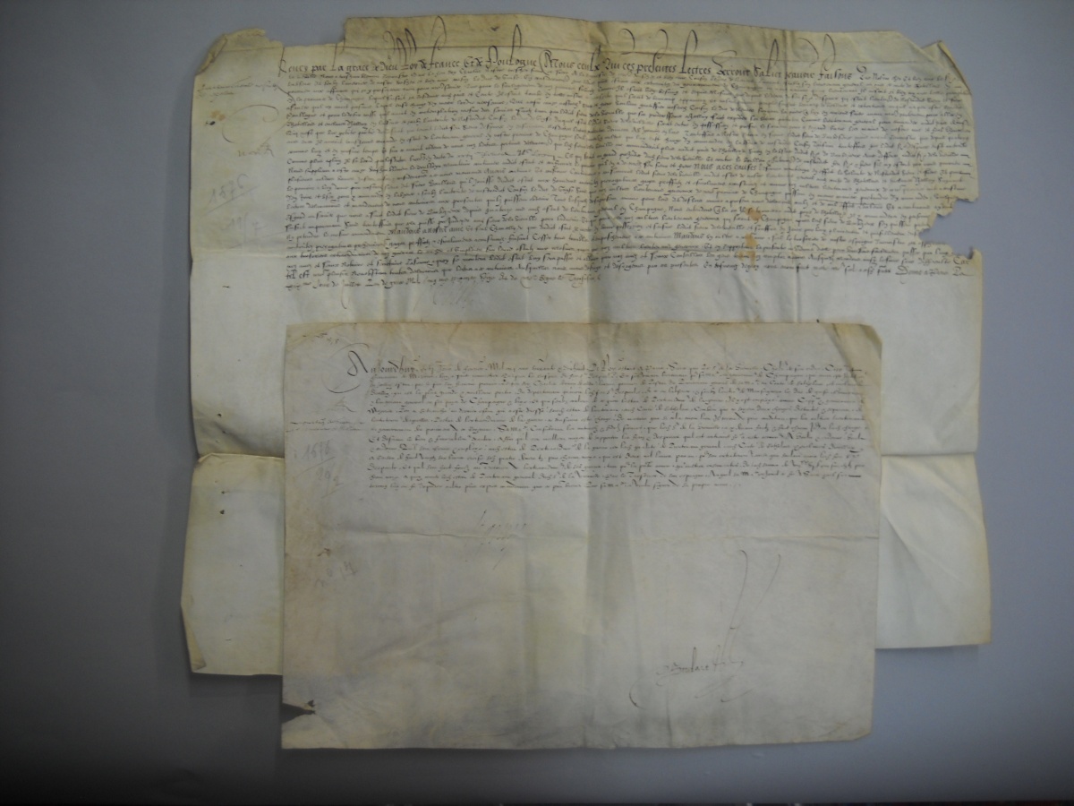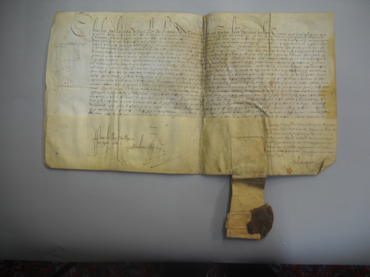 P.S., Paris, 13 avril 1564, par Louis de Gonzague (1539-1595), duc de Nevers, et par son épouse Henriette de Clèves, vélin obl. in-fol. plié. Lettres de provision de la charge du gouvernement du comté de Rethel et de la baronnie de Rozoy accordées à Pierre de la Vieuville. - P.S., Blamont, 30 novembre 1573, par Louis de Gonzague (1539-1595), duc de Nevers, et par son épouse Henriette de Clèves, vélin obl. in-fol. plié, reste de sceau de cire rouge. Lettres de provision de la charge du gouvernement du comté de Rethel et de la baronnie de Rozoy accordées à Robert de la Vieuville. - P.S., Saint-Germain-en-Laye, 27 février 1574, signée " Charles " [Charles IX, roi de France (1550-1574)] et contresignée par le secrétaire d'état [Pierre] Brûlart, vélin obl. in-fol. plié, reste de sceau de cire rouge. Lettres de provision de lieutenant-général dans le comté de Rethélois et enclaves de Champagne, sous l'autorité du duc de Guise, grand maître de France et lieutenant-général de Sa Majesté en Champagne, délivrées à Robert de la Vieuville. - P.S., Paris, 19 juillet 1576, signée " Henry " [Henri III, roi de France (1551-1589)] et contresignée par le secrétaire d'état [Pierre] Brûlart, vélin obl. in-fol. plié (manques). Lettres de provision confirmant la charge de lieutenant-général, malgré les prétentions du sieur de Barbezieux, nouveau lieutenant général de la province. - P.S., Blois, 7 mars 1577, par le secrétaire d'état [Simon] Fizes de Sauve et contresignée par le secrétaire du maréchal de Cossé, vélin obl. in-fol. plié. Commission de capitaine d'une compagnie de 50 hommes d'armes délivrée à Robert de la Vieuville. - P.S., Paris, 26 février 1578, signée " Henry " [Henri III, roi de France (1551-1589)] et contresignée par le secrétaire d'état [Pierre] Brûlart, vélin obl. in-4. Confirmation d'émolument accordée à Robert de la Vieuville en tant que lieutenant-général du comté de Rethélois. - P.S., Paris, 28 juillet 1587, par le secrétaire d'état [Pierre] Brûlart, vélin obl. in-4, reste de sceau et contre-sceau de cire rouge. Ordre du roi " de mettre la ville de Rethel en tel estat de reparation qu'elle puisse estre conservée en seureté soubz notre obéissance (