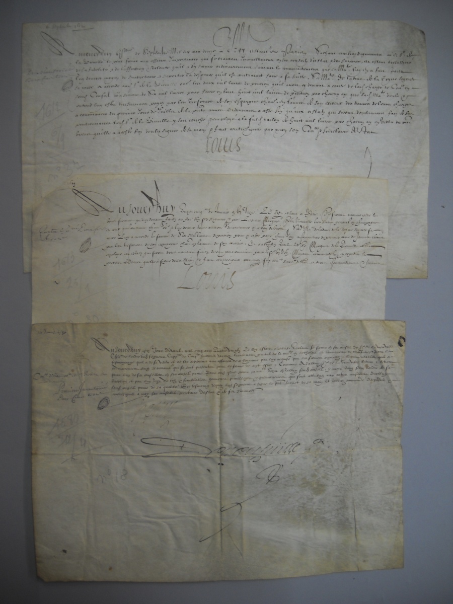 P.S., Paris, 12 avril 1580, signée " Henry " [Henri III, roi de France 1551-1589)] et contresignée par le secrétaire d'état [Nicolas] de Neufville [de Villeroy], vélin obl. in-4. Brevet de conseiller d'état au Conseil privé du roi délivré à Robert de la Vieuville. - P.S., Paris, 6 septembre 1612, signée " Louis " [Louis XIII roi de France (1601-1643)] et contresignée par le secrétaire d'état [Louis] Potier [de Gesvres], vélin obl. Brevet délivré à Robert de la Vieuville conseiller d'état et des finances, d'augmentation de sa pension portée de 2 000 à 8 000 livres. - P.S., Paris, 20 septembre 1612, signée " Louis " [Louis XIII roi de France (1601-1643)] et contresignée par le secrétaire d'état [Louis] Potier [de Gesvres], vélin. Brevet de conseiller d'état délivré à Charles de la Vieuville, à la place de son père décédé. - P.S., Paris, 25 janvier 1613, signée " Louis " [Louis XIII roi de France (1601-1643)] et contresignée par le secrétaire d'état [Antoine] de Loménie, vélin obl. Brevet délivré à Charles de la Vieuville de 6000 livres de pension.