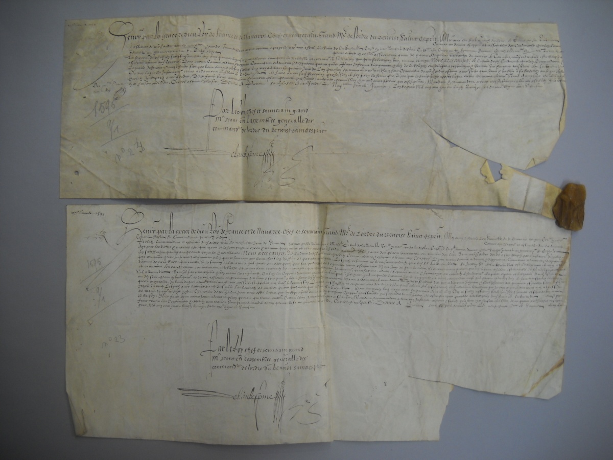 2 P.S. signées le secrétaire d'état [Claude] de l'Aubépine, vélin obl. in-4 dont l'une avec reste de sceau de cire jaune, et l'autre petits manques. Commission aux sieurs d'O et de Beauvais commandeurs de l'ordre du Saint Esprit, l'assemblée dudit ordre, ayant choisi Robert de la Vieuville pour entrer audit chapitre quand il y aura des places du nombre des 100 fixées par les statuts, pour enquêter sur sa noblesse, savoir s'il est gentilhomme de nom et d'armes de trois générations paternelles, si le surnom et armes qu'il porte l'ont été par ses prédécesseurs, de quelles seigneuries ils ont joui, etc ; commission à l'archevêque de Reims, commandeur, pour informer de la religion catholique, apostolique et romaine, les bonnes vies et murs de Robert de la Vieuville. - 3 pièces relatives à l'enquête de bonnes murs, 1595. - Quittance de 12 aunes de velours noir reçu de Robert de la Vieuville par le maître des cérémonies et prévôt de l'ordre du Saint Esprit, 4 janvier 1599. - P.S., Paris, 26 octobre 1614, signée par Brûlart, secrétaire d'état et grand trésorier des Ordres du roi, papier in-fol. Réception entre les mains dudit Brûlart du collier de l'ordre du Saint Esprit que portait le défunt Robert de la Vieuville. - P.S., Paris, 28 novembre 1619, signée " Louis " [Louis XIII roi de France (1601-1643)] et contresignée par le secrétaire d'état [Louis] Potier [de Gesvres], vélin obl. Commission au cardinal de la Rochefoucauld pour enquêter sur les bonnes vie et murs de Charles de la Vieuville, choisi par le roi pour recevoir l'Ordre du Saint Esprit. - Certificat et 2 quittances de paiement délivrées au marquis de la Vieuville pour sa promotion de chevalier dans l'ordre du Saint Esprit, lors de la cérémonie qui s'est tenue en l'église des Augustins à Paris le 31 décembre 1619.