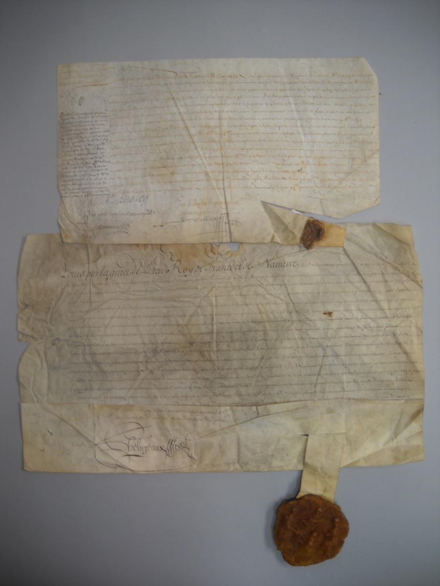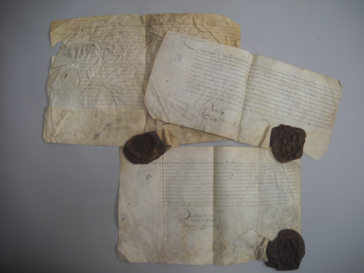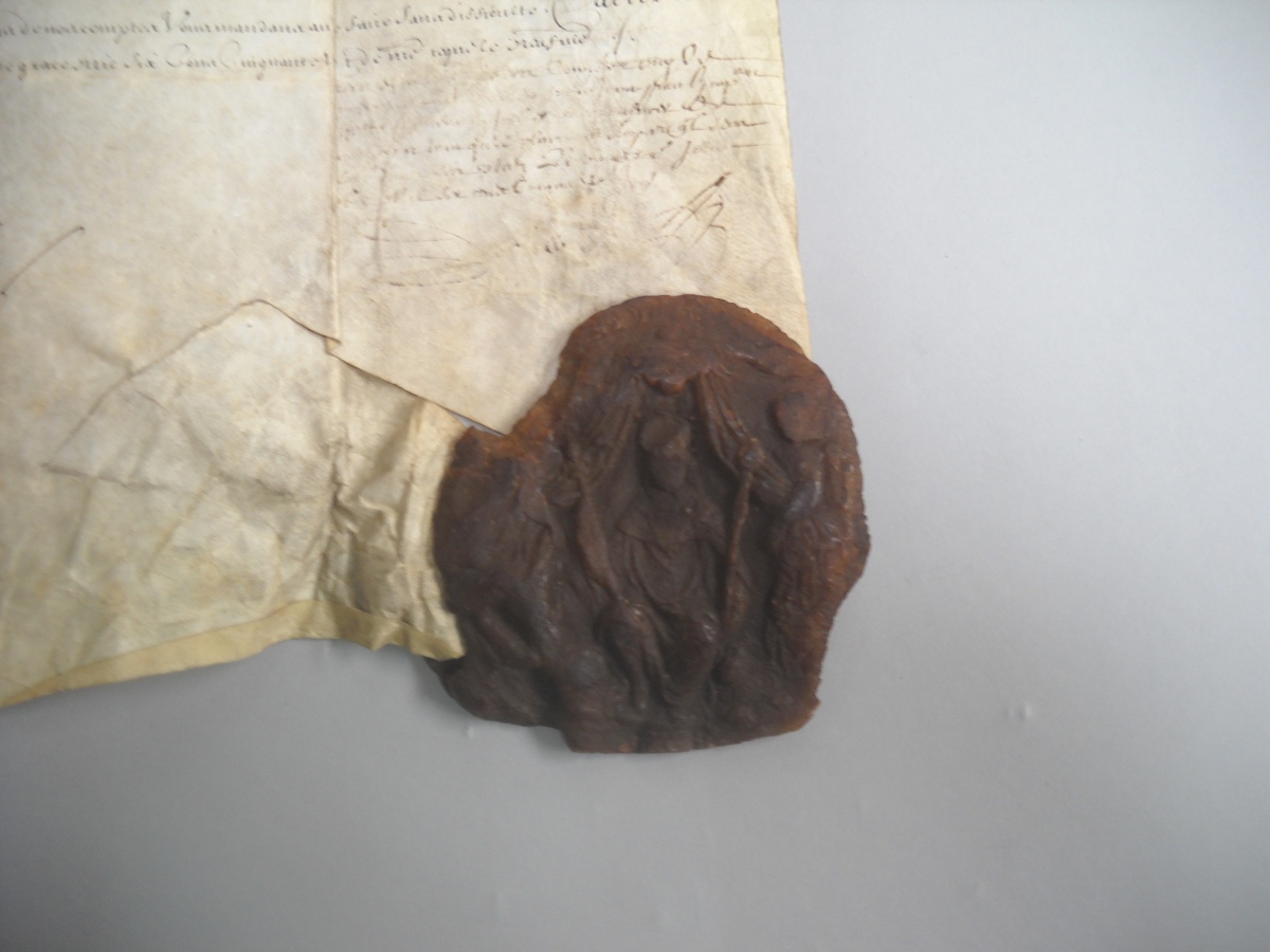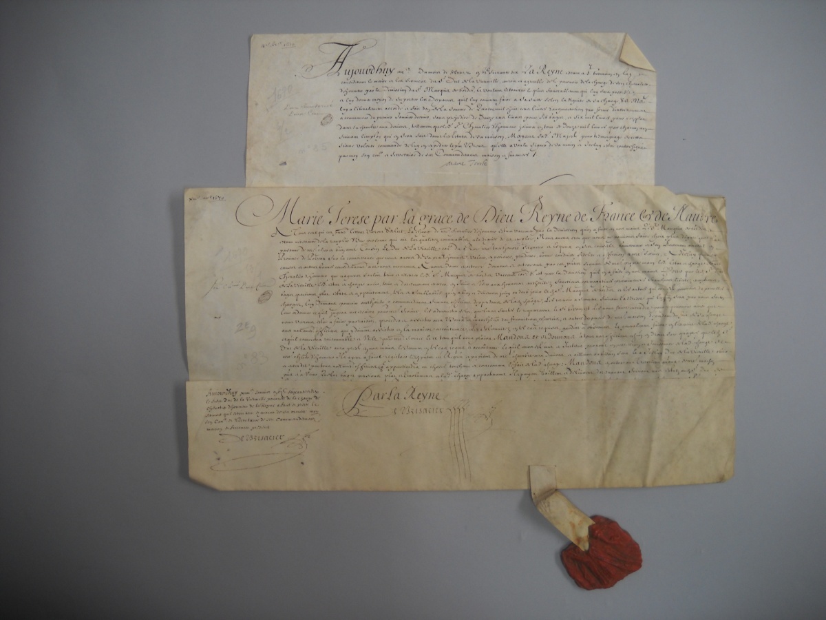P.S., Paris, 8 mars 1645, signée " Louis " [Louis XIV roi de France (1638-1715)] et contresignée par le secrétaire d'état Le Tellier, vélin obl. Commission de mestre de camp du régiment de Picardie. - P.S., Paris, 29 avril 1645, signée " Louis " [Louis XIV roi de France (1638-1715)] et contresignée par de Loménie, vélin, reste de sceau de cire jaune. Lettres patentes du roi délivrant le brevet de conseiller d'état et des finances au marquis de la Vieuville. - 3 P.S., 1646, vélin obl., commission des états généraux des Provinces Unies des Pays-Bas délivrant au marquis de la Vieuville le commandement de lieutenant-colonel du régiment d'Onchamp à la place du sieur de la Capelle. -Traité notarié de vente du régiment de Picardie par Charles Ier de la Vieuville et son fils mestre de camp dudit régiment au profit de René de Quengo, comte de Tonquédec, 20 juin 1648, parchemin, 6 ff. in-4 - P.S., Saint Germain en Laye, 16 janvier 1649, signée " Louis " [Louis XIV roi de France (1638-1715)] et contresignée par le secrétaire d'état [Michel] Le Tellier, vélin. Brevet de maréchal des camps et armées du roi. - 3 P.S., Saint Germain en Laye, 27 janvier 1649, signées " Louis " [Louis XIV roi de France (1638-1715)] et contresignée par le secrétaire d'état Le Tellier, dont une contresignée par Charles de Valois-Angoulême colonel général de la cavalerie française et étrangère, vélin. Commission de lever une nouvelle compagnie de chevau-légers. - Copie du procès-verbal de l'assemblée de la noblesse de Champagne, 1er mars 1649, qui nomme député le marquis de la Vieuville pour se rendre à l'assemblée des États-Généraux tenue à Orléans le 15 mars suivant. - P.S., Paris, 30 juin 1651, signée " Louis " [Louis XIV roi de France (1638-1715)] et contresignée par le secrétaire d'état de Loménie, vélin obl., beau grand sceau de cire jaune aux armes de France. Lettres de pension de 6000 livres au profit du marquis de la Vieuville. - P.S., Poitiers, 2 novembre 1651, signée " Louis " [Louis XIV roi de France (1638-1715)] et contresignée par le secrétaire d'état de Loménie, vélin obl., reste du grand sceau de cire jaune. Brevet de conseiller d'état ordinaire au conseil d'état privé et des finances du roi. - P.S., Saint Denis, 10 juillet 1652, signée " Louis " [Louis XIV roi de France (1638-1715)] et contresignée par le secrétaire d'état Le Tellier, vélin obl., reste du grand sceau de cire jaune. Pouvoir de lieutenant général des armées du roi accordé au marquis de la Vieuville, pour servir en l'armée qui agit auprès du roi en l'absence et sous l'autorité du maréchal de Turenne. - P.S., Melun, 15 juin 1652, signée " Louis " [Louis XIV roi de France (1638-1715)] et contresignée par le secrétaire d'état Le Tellier, vélin obl., reste du grand sceau de cire jaune. Commission de mestre de camp d'un régiment de cavalerie " que commandait pour notre service le feu chevalier de la Vieuville votre frère, étant à présent vacante par son décès ". - 4 pièces, 1654-1664, relatives à l'acquisition du gouvernement du haut et du bas Poitou, et de la ville et du château de Fontenay le Comte, pour plus de 474 000 livres. - P.S., Fontainebleau, 6 juillet 1664, signée " Louis " [Louis XIV roi de France (1638-1715)], vélin. Octroi d'un mois de temps accordé au duc de la Vieuville pour aller faire un voyage en Franche-Comté. - 4 P.S., Paris, 12 septembre 1654, signées " Louis " [Louis XIV roi de France (1638-1715)] et contresignées par le secrétaire d'état Le Tellier, vélin obl., reste du grand sceau de cire jaune. Provisions de la charge de gouverneur et lieutenant général de la province du Haut et du Bas Poitou, Châtelleraudais et Loudunois, ainsi que la charge de gouverneur de la ville et château de Fontenay le Comte. - 6 pièces relatives à l'acquisition de la charge de chevalier d'honneur de la reine, dont 2 P.S., 13 janvier et 4 février 1670, signées " Marie Thérèse " [Marie Thérèse d'Autriche reine de France (1638-1683)], reste de sceau de cire rouge, et P.S., Saint Germain en Laye, 2 février 1670, signée " Louis " [Louis XIV roi de France (1638-1715)] et contresignée par le secrétaire d'état [Jean Baptiste] Colbert. - 2 P.S., Versailles, 12 décembre 1688 et 20 janvier 1689, signées " Louis " [Louis XIV roi de France (1638-1715)] et contresignée pars par le secrétaire d'état de Phélypeaux, dont une avec superbe grand sceau de cire jaune aux armes de France. Brevet de commandeur de l'Ordre du Saint Esprit.