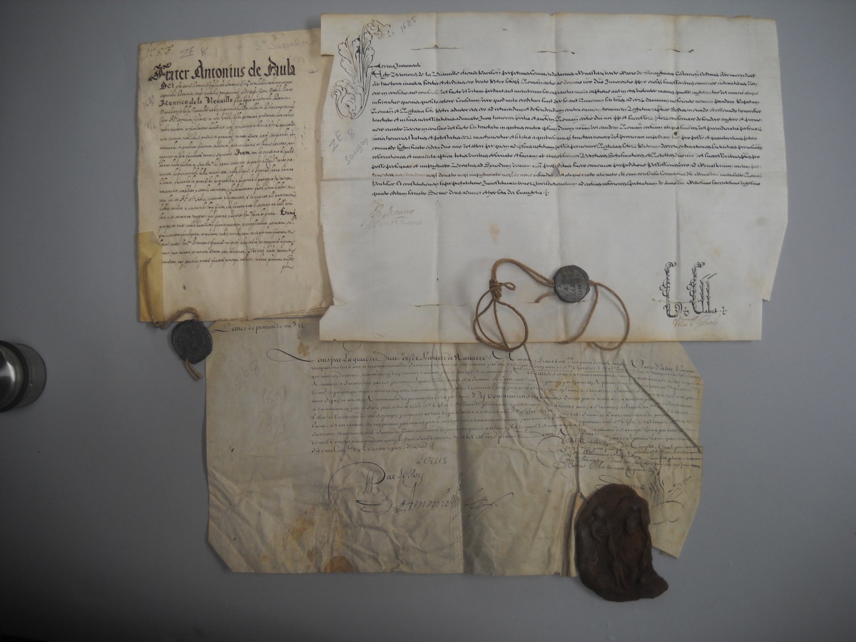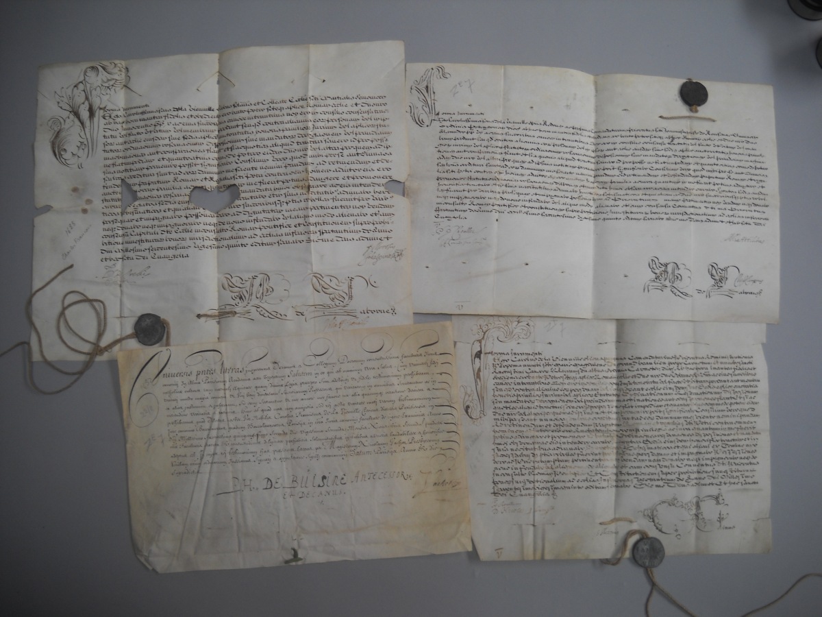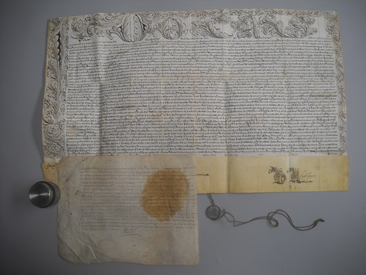Lot de + de 55 pièces, parchemin et papier, dont plusieurs vélins écrits en latin à l'encre brune, lettrines, signatures et diverses bulles papales de plomb pendantes sur cordelette de chanvre jaune et rose d'Urbain VIII (pape de 1623 à 1644), d'Innocent X (pape de 1644 à 1655), d'Alexandre VII (pape de 1655 à 1667), et d'Innocent XI (pape de 1676 à 1689), concernant les provisions de bénéfices et prises de possession des prieurés de Grand-Beaulieu les Chartres et de Sainte Trinité de Combourg, des abbayes de Savigny (près d'Avranches), de Saint Martial de Limoges et de Saint Laumer de Blois. Dont 1 pièce encadrée. - P.S., château de Blois, 14 décembre 1643, signée " Gaston " [Gaston de France, dit d'Orléans (1608-1660)], vélin. Résignation du prieuré de Grand Beaulieu par Charles de la Vieuville à Henri de la Vieuville son frère. - Acte de réception dans l'ordre des hospitaliers de Saint Jean de Jérusalem d'Henri de la Vieuville, 1631, papier, bulle de plomb du grand maître Antoine de Paule. - P.S., Poitiers, 2 novembre 1651, signée " Louis " [Louis XIV roi de France (1638-1715)] et contresignée par le secrétaire d'état de Loménie, vélin obl. Brevet de conseiller d'état délivré au chevalier de la Vieuville. - P.S., Paris, 20 septembre 1651, signée " Louis " [Louis XIV roi de France (1638-1715)], vélin obl., reste du grand sceau de cire jaune aux armes de France. Lettres patentes du roi accordant 4000 livres de pension au chevalier de la Vieuville. - P.S., Sully-sur-Loire, 1er avril 1652, signée " Louis " [Louis XIV roi de France (1638-1715)], vélin obl. Lettres patentes du roi ordonnant l'abbé de la Vieuville conseiller au conseil d'état privé et des finances du roi. - P.S., Sedan, 4 juillet 1654, signée " Louis " [Louis XIV roi de France (1638-1715)], vélin obl. Lettres patentes du roi ordonnant l'abbé de la Vieuville conseiller ordinaire au conseil d'état privé et des finances du roi. - P.S., Paris, 1er novembre 1652, signée " Louis " [Louis XIV roi de France (1638-1715)], vélin obl. Donation par le roi de l'abbaye et collégiale de Saint Martial de Limoges. - P.S., château de Blois, signée " Gaston " [Gaston de France, dit d'Orléans (1608-1660)], vélin obl. Accord par Gaston d'Orléans de la suppression et extinction du titre du prieuré de Grand Beaulieu les Chartres pour y être érigé un séminaire et résignation de la pension de 2000 livres auu profit de l'abbaye de Saint Laumer de Blois. - P.S., château de Blois, 12 mars 1659, signée " Gaston " [Gaston de France, dit d'Orléans (1608-1660)], vélin. Confirmation de la nomination de Charles François de la Vieuville abbé commendataire de l'abbaye de Saint Laumer de Blois. - P.S., Saint Germain en Laye, 3 février 1676, signée " Louis " [Louis XIV roi de France (1638-1715)], vélin. Don de l'abbaye commendataire de Savigny de l'Ordre de Citeaux à François Marie de la Vieuville, fils de Charles II.