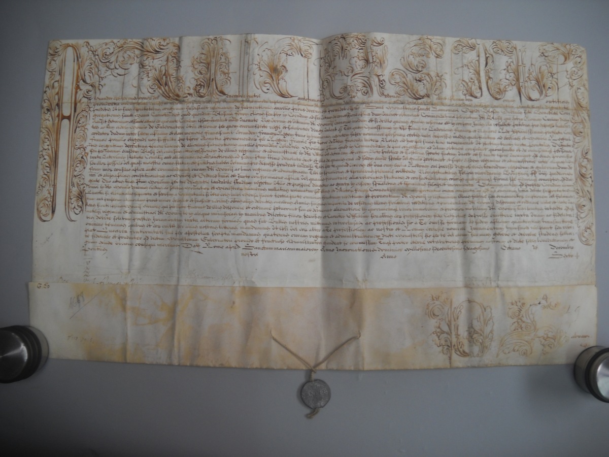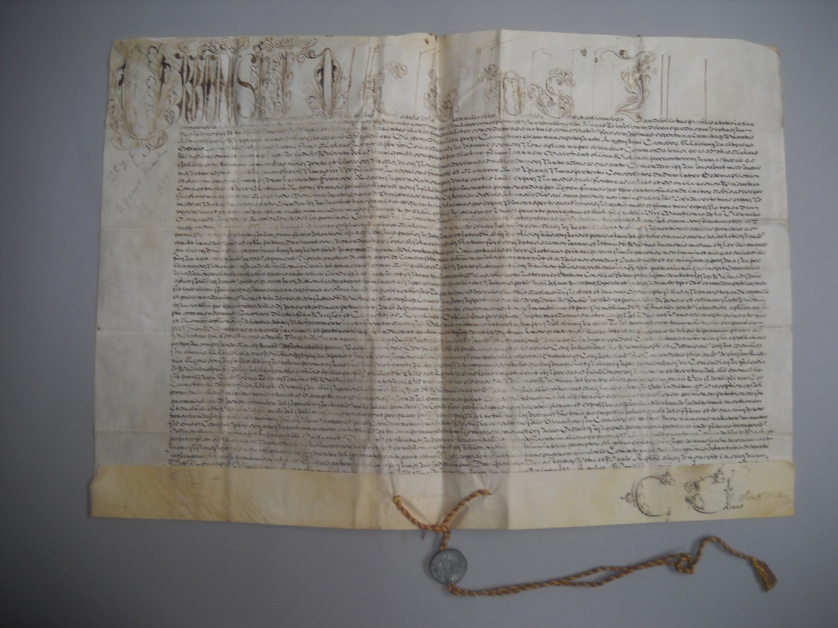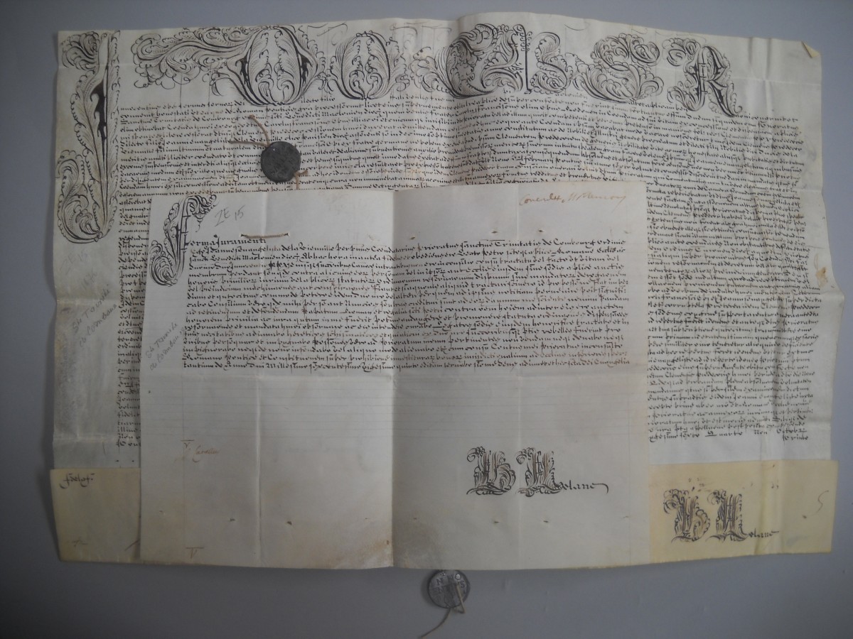 Lot de + de 55 pièces, parchemin et papier, dont plusieurs vélins écrits en latin à l'encre brune, lettrines, signatures et diverses bulles papales de plomb pendantes sur cordelette de chanvre jaune et rose d'Urbain VIII (pape de 1623 à 1644), d'Innocent X (pape de 1644 à 1655), d'Alexandre VII (pape de 1655 à 1667), et d'Innocent XI (pape de 1676 à 1689), concernant les provisions de bénéfices et prises de possession des prieurés de Grand-Beaulieu les Chartres et de Sainte Trinité de Combourg, des abbayes de Savigny (près d'Avranches), de Saint Martial de Limoges et de Saint Laumer de Blois. Dont 1 pièce encadrée. - P.S., château de Blois, 14 décembre 1643, signée " Gaston " [Gaston de France, dit d'Orléans (1608-1660)], vélin. Résignation du prieuré de Grand Beaulieu par Charles de la Vieuville à Henri de la Vieuville son frère. - Acte de réception dans l'ordre des hospitaliers de Saint Jean de Jérusalem d'Henri de la Vieuville, 1631, papier, bulle de plomb du grand maître Antoine de Paule. - P.S., Poitiers, 2 novembre 1651, signée " Louis " [Louis XIV roi de France (1638-1715)] et contresignée par le secrétaire d'état de Loménie, vélin obl. Brevet de conseiller d'état délivré au chevalier de la Vieuville. - P.S., Paris, 20 septembre 1651, signée " Louis " [Louis XIV roi de France (1638-1715)], vélin obl., reste du grand sceau de cire jaune aux armes de France. Lettres patentes du roi accordant 4000 livres de pension au chevalier de la Vieuville. - P.S., Sully-sur-Loire, 1er avril 1652, signée " Louis " [Louis XIV roi de France (1638-1715)], vélin obl. Lettres patentes du roi ordonnant l'abbé de la Vieuville conseiller au conseil d'état privé et des finances du roi. - P.S., Sedan, 4 juillet 1654, signée " Louis " [Louis XIV roi de France (1638-1715)], vélin obl. Lettres patentes du roi ordonnant l'abbé de la Vieuville conseiller ordinaire au conseil d'état privé et des finances du roi. - P.S., Paris, 1er novembre 1652, signée " Louis " [Louis XIV roi de France (1638-1715)], vélin obl. Donation par le roi de l'abbaye et collégiale de Saint Martial de Limoges. - P.S., château de Blois, signée " Gaston " [Gaston de France, dit d'Orléans (1608-1660)], vélin obl. Accord par Gaston d'Orléans de la suppression et extinction du titre du prieuré de Grand Beaulieu les Chartres pour y être érigé un séminaire et résignation de la pension de 2000 livres auu profit de l'abbaye de Saint Laumer de Blois. - P.S., château de Blois, 12 mars 1659, signée " Gaston " [Gaston de France, dit d'Orléans (1608-1660)], vélin. Confirmation de la nomination de Charles François de la Vieuville abbé commendataire de l'abbaye de Saint Laumer de Blois. - P.S., Saint Germain en Laye, 3 février 1676, signée " Louis " [Louis XIV roi de France (1638-1715)], vélin. Don de l'abbaye commendataire de Savigny de l'Ordre de Citeaux à François Marie de la Vieuville, fils de Charles II.