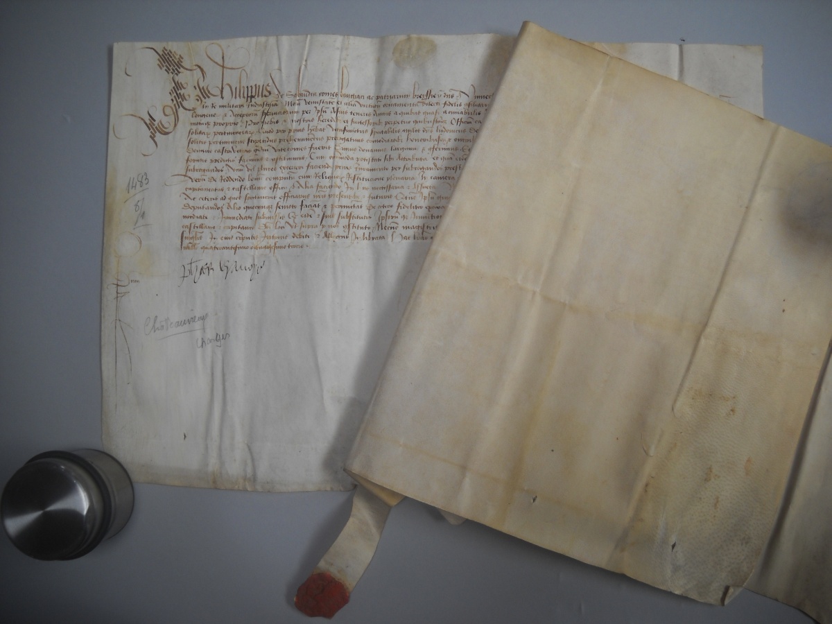 2 P.S., l'une datée de 1483, signée Philippe de Bresse (1438-1497) régent du duché de Savoie jusqu'en 1482, puis duc de Savoie de 1496 à 1497 ; l'autre datée de 1497 et signée Philibert II le Beau, duc de Savoie (1480-1504), vélin obl., avec sceaux aux armes de Savoie en cire rouge et sous papier. - P.S. datée de 1495, Blanche de Montferrat, régente du duché de Savoie (1472-1519), reste de sceau de cire rouge. Concerne Guy de Châteauvieux, chevalier, seigneur dudit lieu, premier chambellan et maître d'hôtel de Philippe de Bresse, qui lui confie en 1493 la charge de gouverneur, lieutenant général et bailli du pays de Bresse.