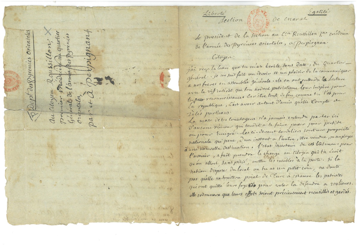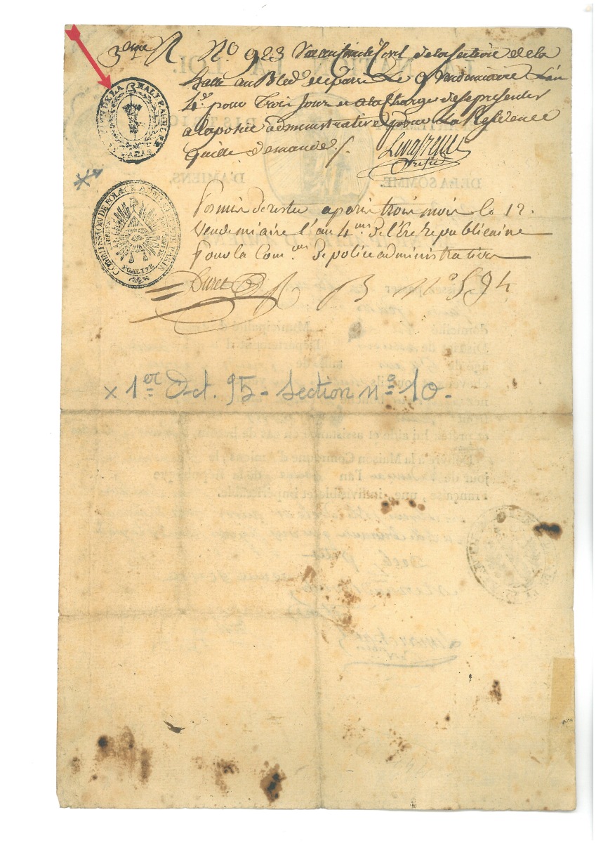 Lettre imprimée du président de la section de l'Hôtel de Ville, 26 sept. 1791 - Certificat de résidence délivré et signé par les officiers de la section des Tuileries, 5 nov. 1791, vignette révolutionnaire - L.S. par Nicolas CHAMBON de MONTAUX (maire de Paris du 30 nov. 1792 à fév. 1793), 31 mars 1792, vignette - Congé absolu délivré à un fusilier de la garde nationale parisienne, bataillon des ports, quais et isles de Paris, 30 juin 1792, signatures, vignette et encadrement impr. - Certificat de serment de fidélité la République délivré par la section du Marais, 3 sept. 1792, en partie impr. - Reçu d'un dépôt d'armes délivré par la section d'Henri IV (devenu par la suite du Pont Neuf), 3 sept. 1792, cachet de cire rouge - Certificat délivré par les officiers civils et militaires de la section du Fauxbourg Montmartre, 14 sept. 1792, en-tête imprimé - Passeport délivré par le ministère de la guerre, cachet cire rouge, et cachet rond de la section des Champs Elysées, février 1794 - Procès-verbal du vote des officiers de la compagnie révolutionnaire de la section de la République, 26 mars 1794, cachet encre rouge de la section - Nomination délivrée par la section de l'Homme Armé, 27 mars 1794, cachet encre de la section - Ordre de mobilisation de la section Guillaume Tell, 3 avril 1794, en-tête - Certificat de service délivré à un fusilier de la 2e Cie de la force armée de la section de Bonne Nouvelle, 15 signatures, 2 juin 1794, cachet encre du comité militaire de la section - Certificat délivré par les membres du comité de surveillance de la section Poissonnière, 11 juin 1794, cachet encre de la section - L.A.S. de FARIAU, président de la section de Marat et Marseille, 4 juillet 1794, cachet encre rouge de la section - Certificat signé par les membres de la section de l'Observatoire, 12 juillet 1794, cachet encre de la section - L.S. du comité révolutionnaire de la section de la Fidélité, 31 août 1794, cachet encre du comité - Extrait des procès-verbaux du comité de la section des Quinze-Vingts, 1er sept. 1794, en-tête et cachet encre de la section - Certificat délivré par la section des Quinze-Vingts, 4 mars 1795, cachet encre de la section - Certificat délivré par la section de l'Unité à un canonnier d'artillerie, 15 mai 1795, cachet encre de la section - Laissez-passer de la commune d'Amiens, 9 vendémiaire an IV (1er octobre 1795), au verso cachet encore noir de la section de la Halle au Bled - Carte de sûreté délivrée par la section de la Réunion, 21 juin 1797, en partie imprimée sur papier fort gris bleu, vignette - Carte de sûreté délivrée par la section de Chalier, s. d.