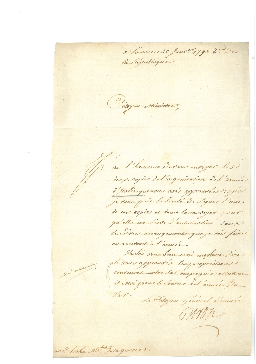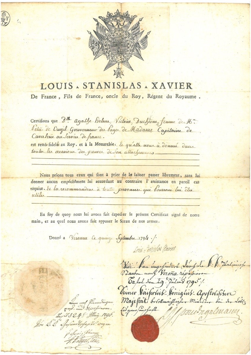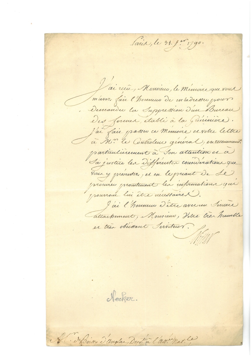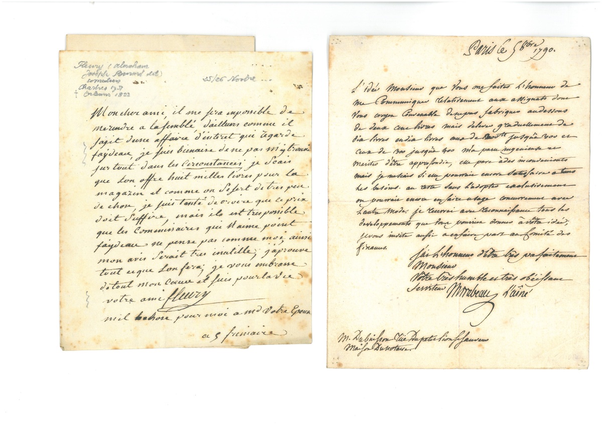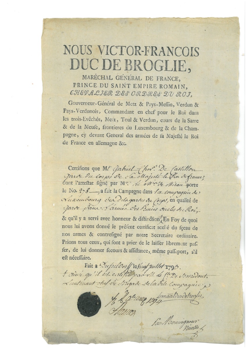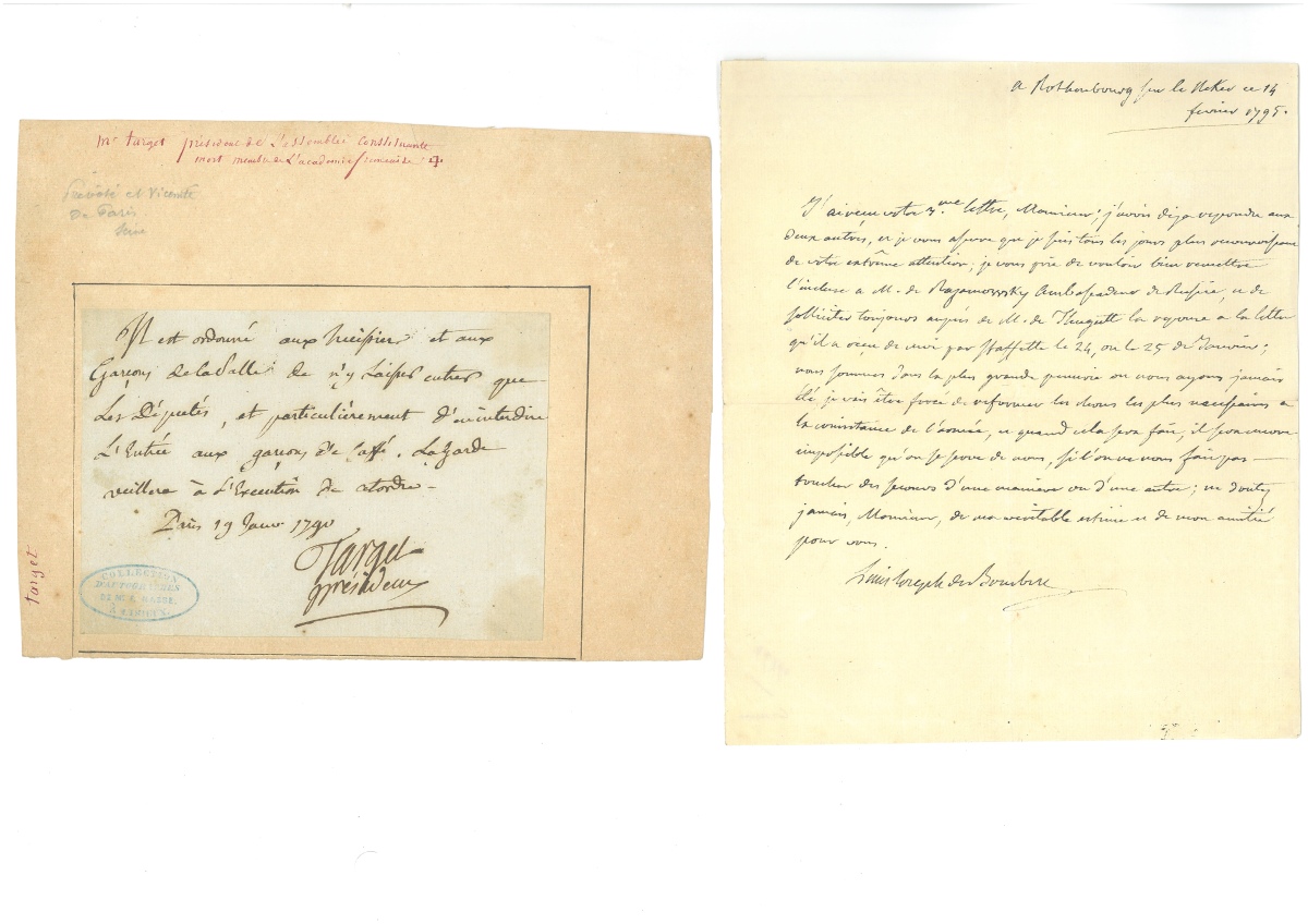 P.S. de Guy Jean Baptiste TARGET (1733-1806), 19 janvier 1790 - L.S. de Jacques NECKER (1732-1804), premier ministre des finances, 31 janvier 1790, 1 page in-fol. - L.S. d'Honoré Gabriel Riqueti, comte de MIRABEAU (1749-1791), Paris, 5 octobre 1790, 1 page in-4, relative à la fabrication d'assignats - L.S. d'Armand-Louis de GONTAUT, duc de BIRON (1747-1793), ministre de la guerre, 20 janvier 1793, 1 page n-fol. - Certificat de service " dans l'armée des Princes oncles du roy ", signé par Victor-François de BROGLIE (1718-1804) commandant de l'armée des émigrés de Condé, Düsseldorf, 20 juillet 1793, 1 page in-fol., en-tête impr. " Nous Victor-François duc de Broglie, maréchal général de France, prince du Saint Empire Romain, chevalier des ordres du roi ", beau cachet de cire noire - Beau laissez-passer signé par " Louis Stanislas Xavier ", futur Louis XVIII roi de France, Vérone, 15 septembre 1794, 1 page grand in-fol. en partie impr. à son en-tête " Louis-Stanislas-Xavier de France, fils de France, oncle du Roy, régent du royaume ", vignette aux armes, sceau sous papier et cachet cire rouge aux armes. - L.A.S. de Louis Joseph de BOURBON, prince de Condé (1736-1818), chef de l'armée des émigrés, " à Rothenbourg sur le Necker ", 14 février 1795, 1 page in-4, relative aux difficultés de l'armée des émigrés - L.A.S. d'Abraham Joseph Bénard, dit FLEURY (1750-1822), acteur, sociétaire et doyen de la Comédie française, 1 pages in-8.