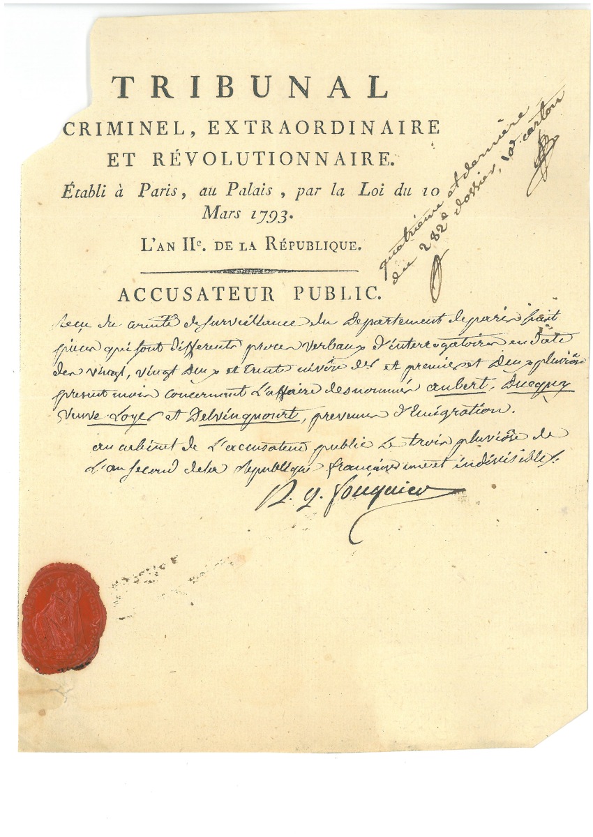 P.S., " A.Q. Fouquier ", " au cabinet de l'accusateur public " 3 pluviôse an II (22 janvier 1794), 1 page in-4, en-tête " Tribunal Criminel, Extraordinaire et Révolutionnaire [...] Accusateur-Public ", beau cachet de cire rouge.