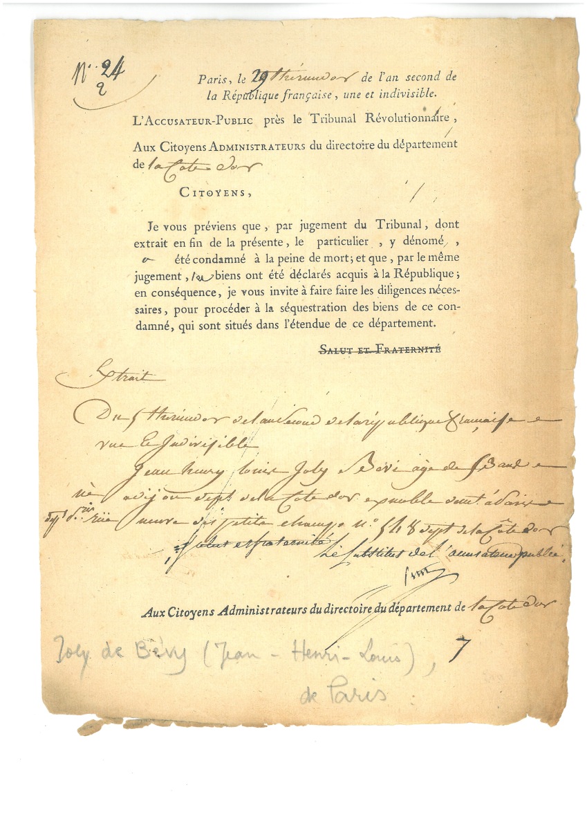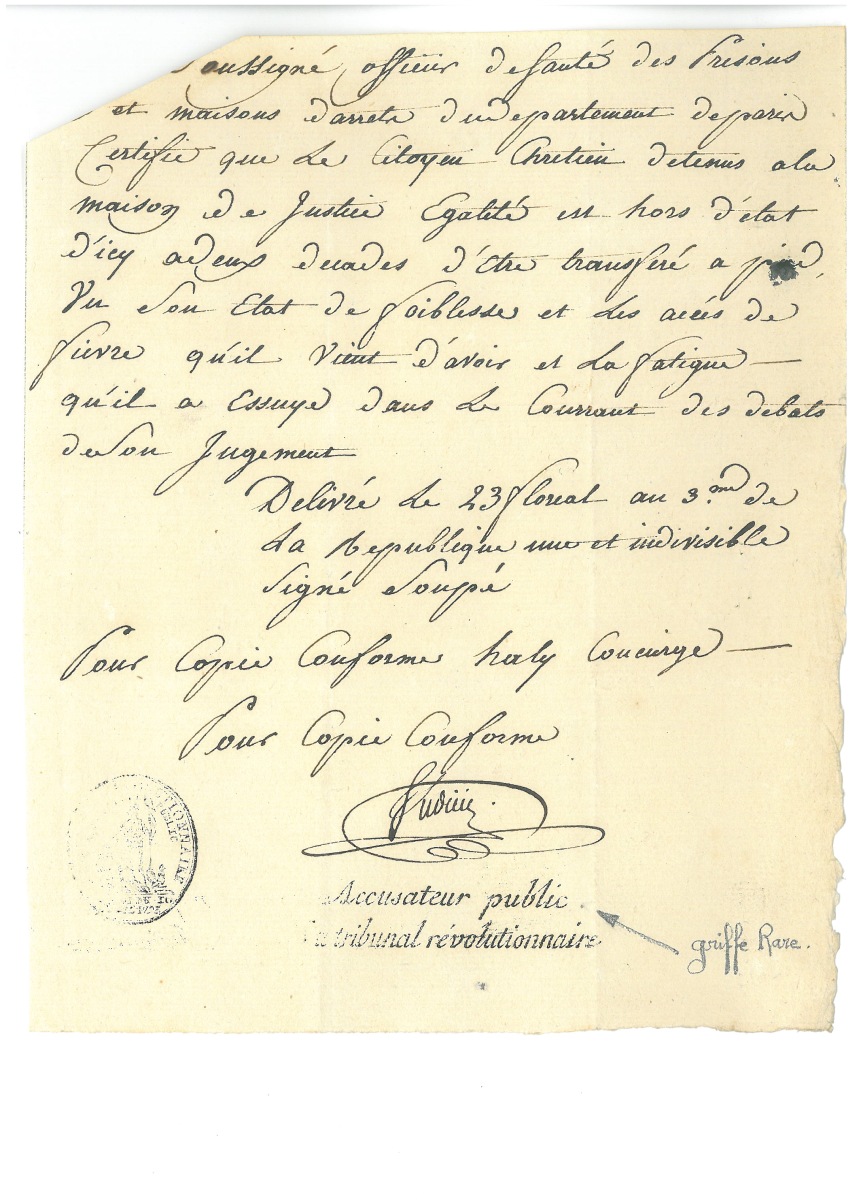 Joint: L.S. d'Antoine JUDICIS, accusateur public et successeur de Fouquier de Tinville (guillotiné le 7 mai 1795), Paris, 23 floréal an III (12 mai 1795), sur copie d'un rapport d'état de santé d'un détenu emprisonné " à la maison de justice Egalité " (ex collège Plessis), rare griffe noire " Accusateur public du tribunal révolutionnaire ". - P.S. par l'accusateur public, 4 nivôse an VI (23 décembre 1797), 1 page in-4, en-tête " Tribunal criminel du département de Paris. Mandat d'arrêt de par la loi ". Ordre d'arrestation. - P.S. du substitut de l'accusateur public, 29 thermidor an II (16 août 1794), 1 page in-4, en-tête " L'accusateur public près le tribunal révolutionnaire ". Condamnation à mort de de Jean Henry Louis Joly de Bévi ex noble de Dijon [exécuté le même jour].