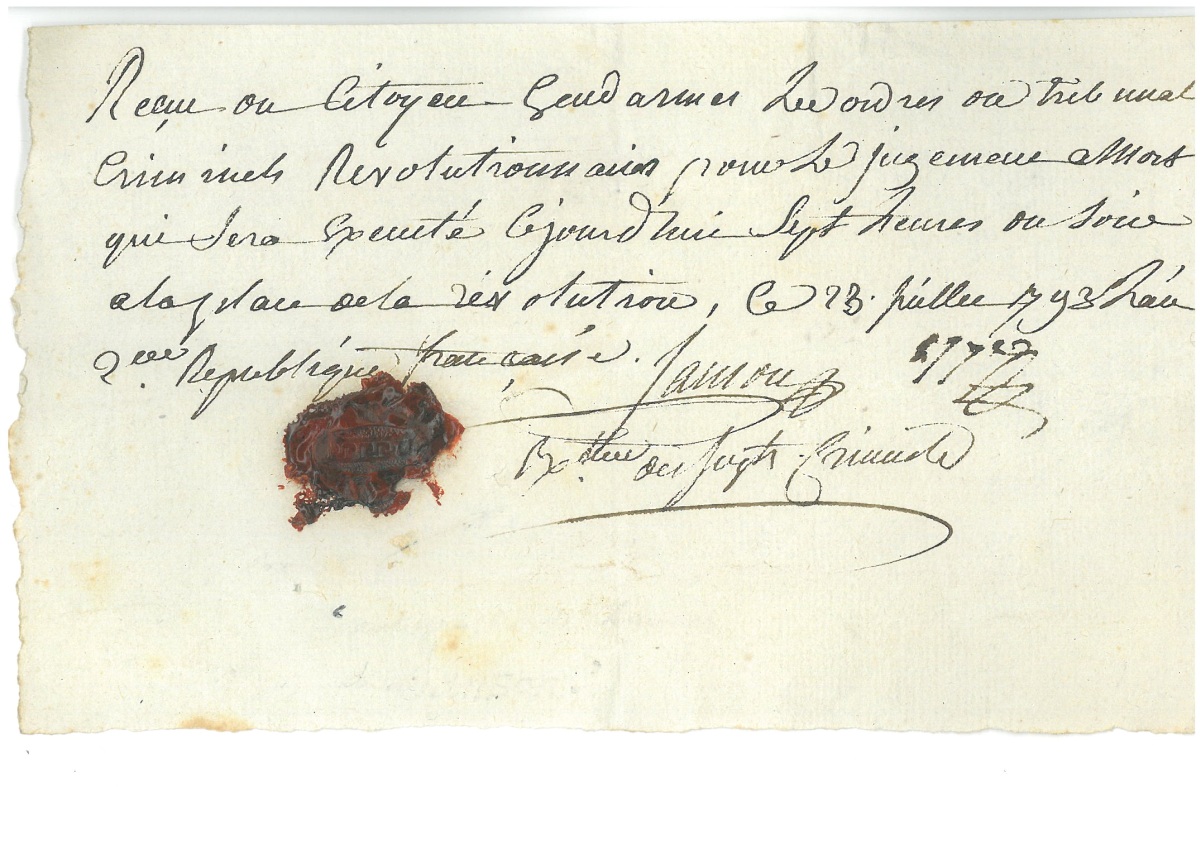 " Reçu du citoyen gendarme les ordres du tribunal criminel révolutionnaire pour le jugement à mort qui sera exécuté ce jourd'hui sept heures du soir à la place de la révolution