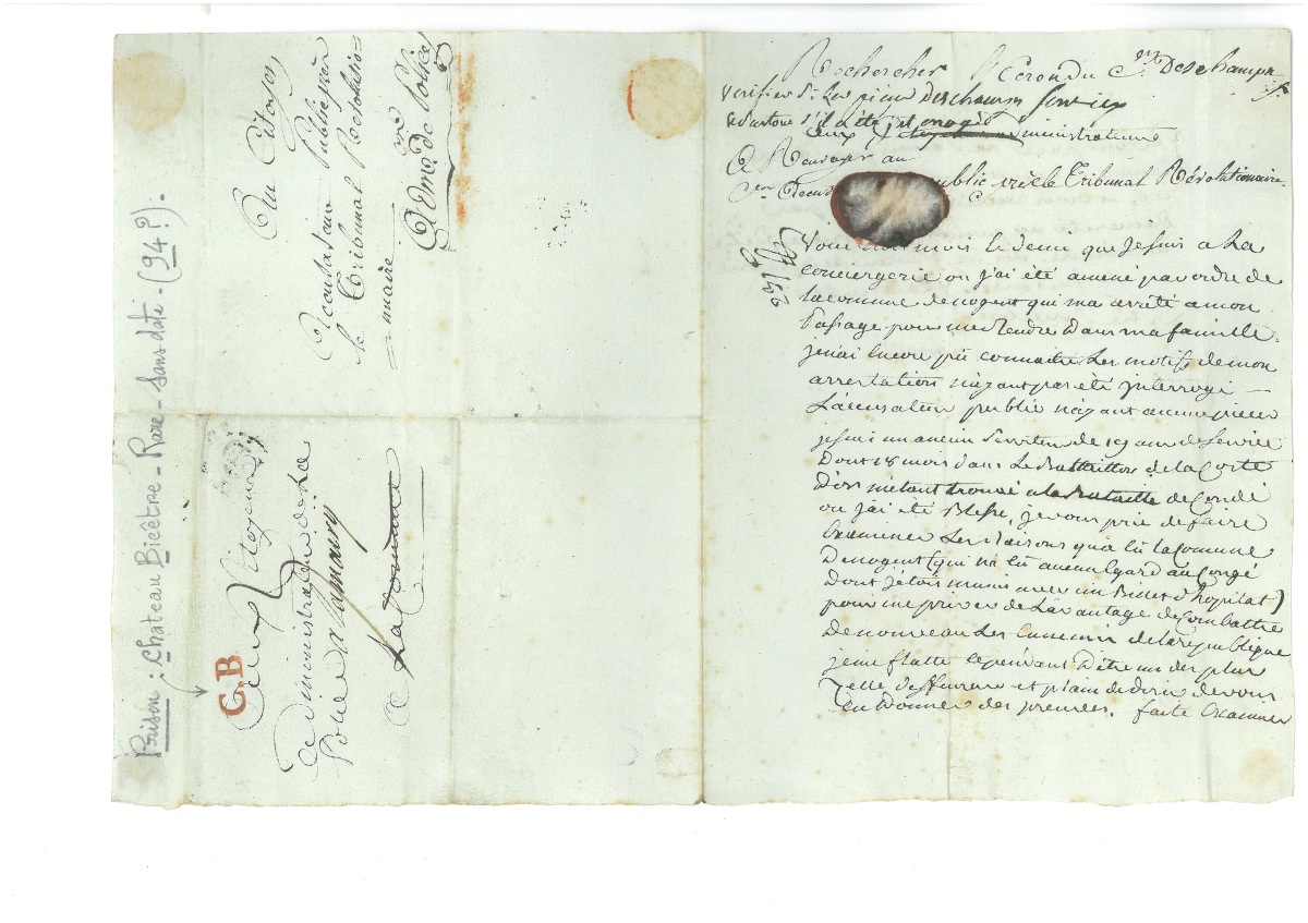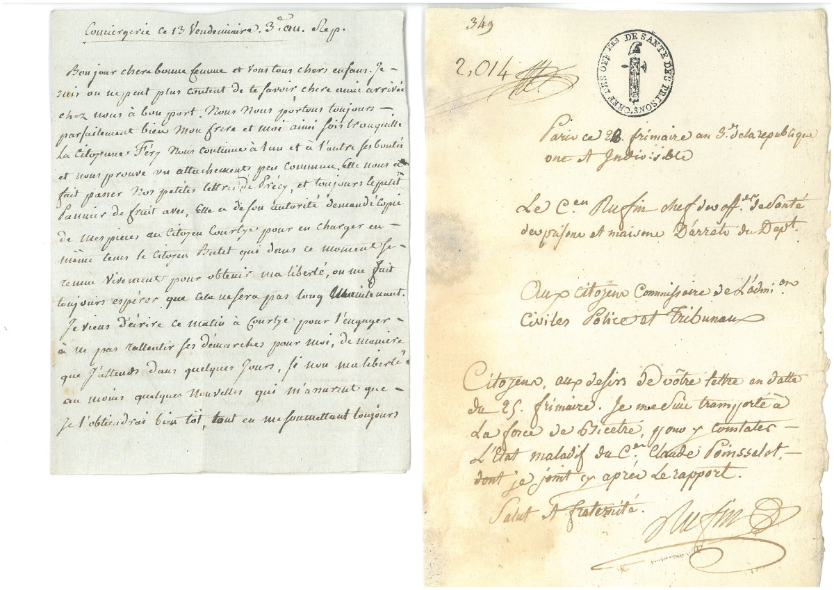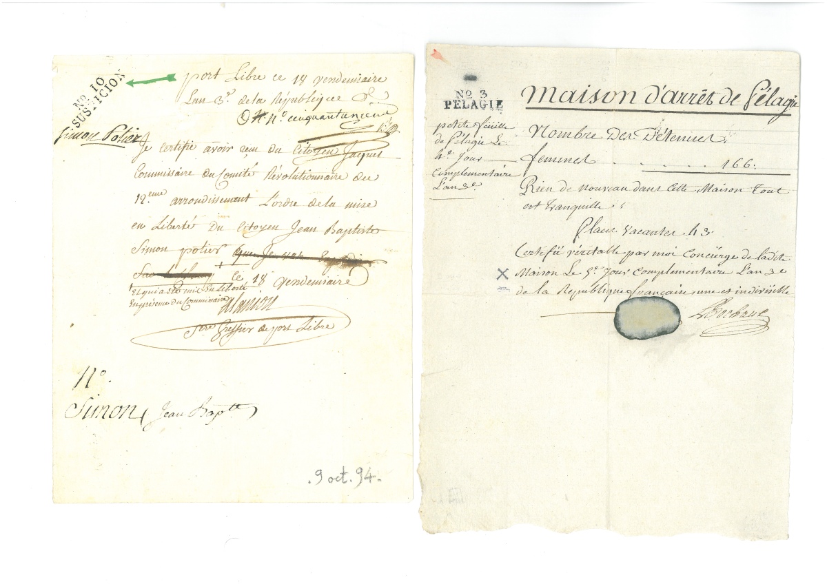 " - P.S. par les conventionnels BOURDON de l'OISE, CLAUZEL, LEGENDRE, LESAGE-SENAULT, REUBELL et REVERCHON, 10 brumaire an III (31 octobre 1794), 1 page in-fol., en-tête et sceau sous papier, cachet de la prison des Carmes au dos. Mise en liberté de Raphaël Petit, détenu à la maison d'arrêt des Carmes. - L.A.S. de " Deschamps ", 1 page ½ in-8, avec marque " CB " en rouge (CB = Château Bicêtre), et marque postale de la petite poste de Paris: marque linéaire avec K et PD. Lettre d'un soldat arrêté à Nogent et transféré à la Conciergerie, puis à l'hôpital de Bicêtre transformé en prison. - P.S. par le concierge " de la maison d'arrêt de la rue de la Bourbe " (prison de Port Libre), 5 ventôse an II (23 fév. 1794), rare cachet de cire rouge " Maison d'arrêt du Port Libre " - L.S. d' " ALANION " secrétaire greffier de Port Libre (ex abbaye de Port Royal de Paris), 18 vendémiaire en III (9 octobre 1794), 1 page in-4, avec marque postale " N°10 SUSPICION " en noir. Ordre de mise en liberté. - L.A.S. du chef des officiers de santé des prisons, 28 frimaire an III (18 décembre 1794), 1 page in-8, avec superbe cachet révolutionnaire. - P.S. par le concierge de la " maison d'arrêt de Pélagie " [ancien couvent de Sainte Pélagie], ½ page in-4, avec marque postale " N°3 PELAGIE " en noir. Nombre des détenues femmes. - 3 L.A.S. de la famille LELARDEUX, une écrite de la prison de la Conciergerie, du 13 vendémiaire an III (4 octobre 1794), avec marque postale du timbre P, et les deux autres reçues par le détenu en 1794 - L.A.S. d'un fils, écrite de Château Chinon en Bretagne, 24 floréal an II (13 mai 1794), adressée à son père détenu " à la maison d'arrêt du cidevant collège du Plessis " à Paris - Tableau imprimé intitulé " Etat numératif des détenus dans les maisons d'arrêt, de justice et de détention ", au 16 pluviôse an III (4 février 1795), au nombre de 16 établissements, 1 page imprimée et partie manuscrite, 1 page in-4. - Extrait d'écrou délivré et signé par " Delavaquerie concierge " de la maison d'arrêt de Port Libre, 25 prairial an III (13 juin 1795), en-tête et cachet encre noir de la prison -