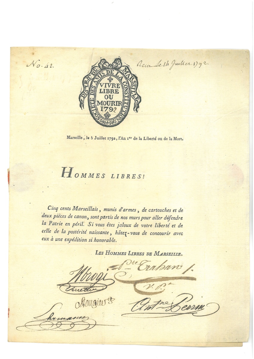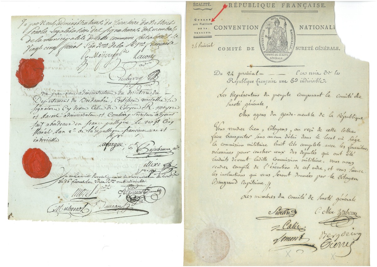" - Carte de fédéré de 1792, impr., 11,5 x 8 cm - Billet d'entrée à l'Hôtel-Dieu, 6 août 793 - L.S. de la commune nommée " Bedouin l'Infâme " (Vaucluse), 1794 - L.A.S. décrite de Marseille, 1794, en exergue: " Comune sans nom, cydevant Marseille " - Certificat de civisme délivré par la société du club national de Bordeaux, 17 floréal an II (4 mai 1794) avec attestation de civisme - P.S. de l'hôpital général de la Salpêtrière, 1795 - L.A.S. signée par Claude Alexandre YSABEAU, député conventionnel et par les membres du comité de sûreté générale, 24 prairial an III (12 juin 1795), donnant des directives dans la préparation du jugement des députés Montagnards arrêtés lors de l'insurrection de prairial. - Carte d'électeur de l'an V (mars-avril 1797) - Carte civique délivrée par le canton de Bruxelles, 18 pluviôse an VI (6 février 1798) - P.A.S. de Jean Michel MOREAU le jeune (1741-1814), illustrateur et graveur, Paris 1er thermidor an VI (19 juillet 1798), quittance de paiement délivrée à l'éditeur Renouard " pour le payement des quarante huit dessins que j'ai fait pour édition de Gessner