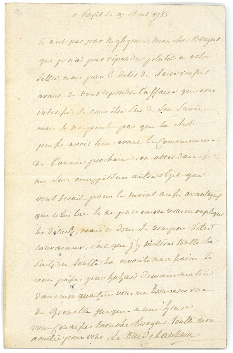 L.A.S. à Abraham-Louis BREGUET, Paris, 9 août 1785 ; 1 page in-16.