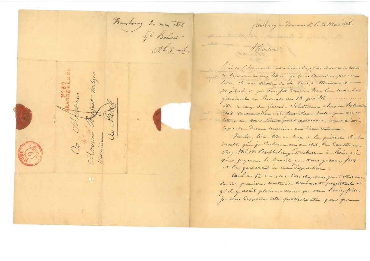 L.A.S. à Abraham-Louis Breguet, Freusbourg, Danemark, 20 mars 1808, 1 page ½ in-4, cachet postal de la Grande Armée.