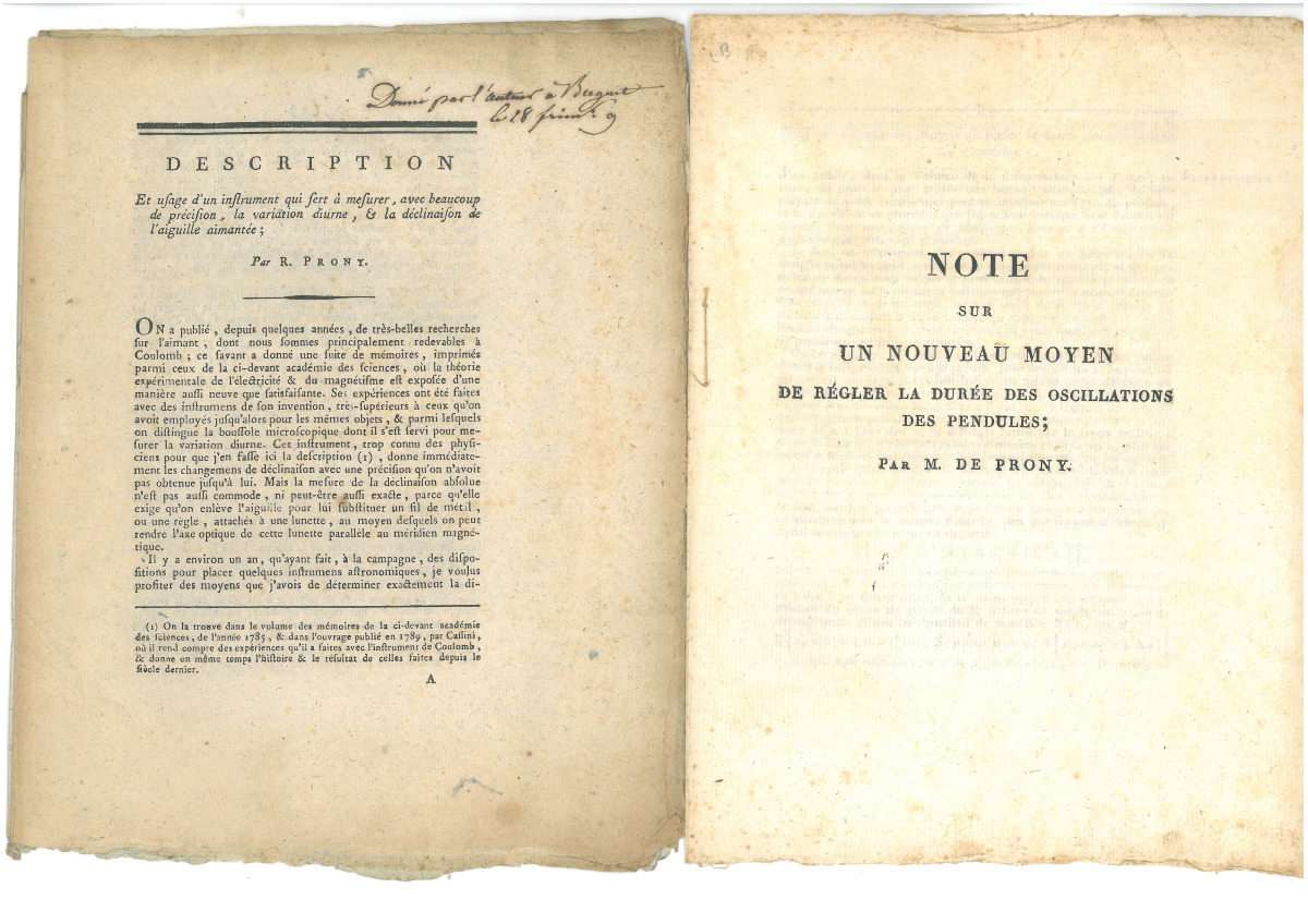 - 3 brochures imprimées: " Note sur un nouveau moyen de régler la durée des oscillations des pendules ", 7 pages in-4 ; " Description et usage d'un instrument qui sert à mesurer, avec beaucoup de précision, la variation diurne, et la déclinaison de l'aiguille aimantée ", 7 pages in-4, avec envoi de l'auteur daté du 18 frimaire an IX ; " Réclamation de M. de Prony, membre de l'institut royal de France contre une interprétation erronée donnée à un passage de son traité de mécanique analitique par M. Kater ", 4 pages in-4.