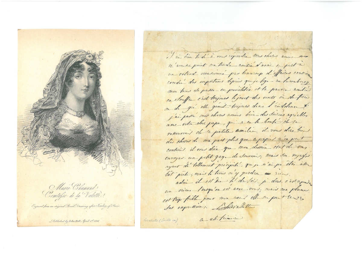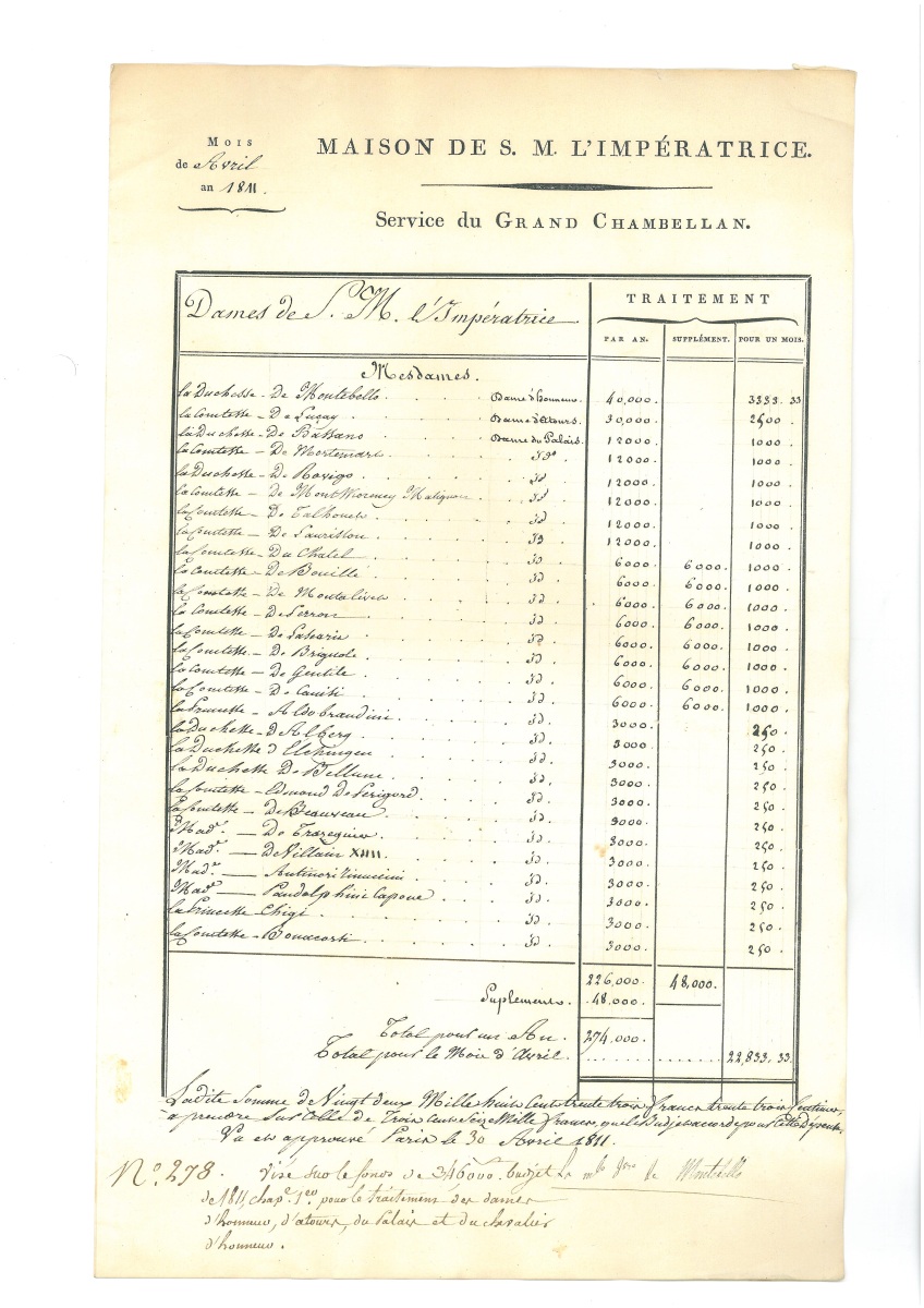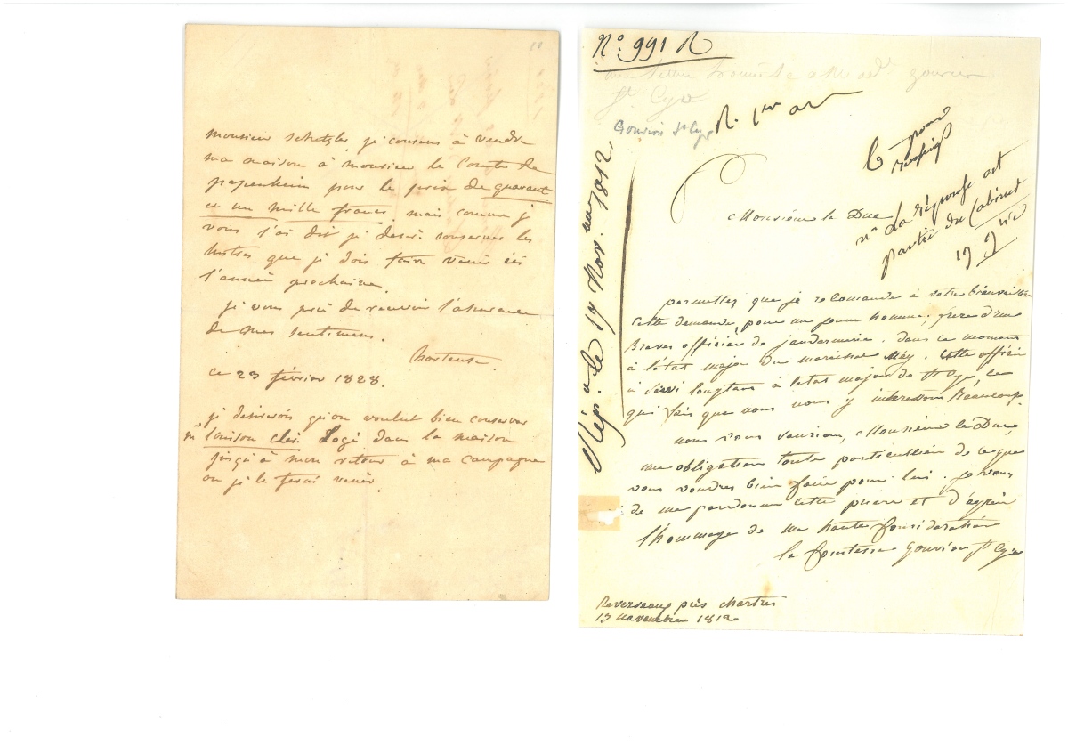 L.A.S. d'Emilie de BEAUHARNAIS, comtesse de LA VALETTE (1781-1855), épouse d'Antoine Marie CHAMANS, directeur des postes, sans lieu, 26 frimaire (s.d.), 1 page in-8, adressée à ses " chères amies ": " J'ai bien tardé à vous répondre (…) excessivement excédée des importuns depuis que je loge au Luxembourg. Mon temps se passe en puérilités et la pauvre amitié en souffre, c'est toujours le jouet des vents ou de force ou de gré elle gémit toujours dans l'indolence… " Joint une gravure la représentant en buste. - L.A.S. de Marie Louise Joséphine de BOURBON (1782-1824), infante d'Espagne et reine d'Etrurie, 1807, adressée à Hector d'AUBUSSON de la Feuillade, ministre plénipotentiaire de France auprès de la reine d'Etrurie, texte en italien, 1 page in-8, belle lettre à entours de décor doré de style Empire. [En 1801, Napoléon transforme le grand-duché de Toscane en royaume d'Étrurie dont elle devient reine, puis régente à la mort de son mari en 1803. En 1807, Napoléon dissout le royaume d'Étrurie dont le territoire est rattaché à l'Empire. Marie-Louise se réfugie à Madrid, puis suit son père destitué et exilé en France par Napoléon, en 1807.] - L.A.S. de Désirée CLARY (1777-1860), un temps fiancée à Napoléon Bonaparte, épouse du général Bernadotte et Reine de Suède, Vichy, 23 juillet, 1 page in-8. Elle remercie un correspondant de s'être occupé pour elle d'une affaire. - L.A.S. de Jeanne Louise Elisabeth BERG (1771-1852), épouse de Jean de Dieu SOULT duc de Dalmatie, maréchal d'Empire, Paris, 27 mars 1809, 1 page ½ in-8, adressée à M. le comte: " (…) les nouvelles de mon mari me parviennent toujours très difficilement ; il sera désespéré de ne pas pouvoir faire la guerre en Allemagne, et je partage bien son chagrin à cet égard. On parle beaucoup du départ prochain de S. M. dont une partie de la maison est en route depuis la semaine dernière… " - P.S. de Louise GUENEHEUC, duchesse de MONTEBELLO (1782-1856), épouse du maréchal d'Empire de LANNES, Paris, 30 avril 1811, 1 page in-fol., titrée " Maison de l'impératrice - service du grand Chambellan ", tableau récapitulant la liste de toutes les dames d'honneur et d'atours de l'Impératrice avec pour chacune leur traitement annuel. - L.A.S. d'Anne GOUVION (1775-1844), épouse de Laurent GOUVION marquis de Saint Cyr, maréchal d'Empire, Reverseaux, 13 novembre 1812, 1 page in-8, sollicitation de placement. - L.A.S. d'Aglaé Louis AUGUIÉ (1782-1854), " princesse de Moskowa ", épouse de Michel NEY maréchal d'Empire, dame de compagnie de l'Impératrice Joséphine, puis de Marie-Louise, 29 mars [1815], 4 pages in-8, adressée à son cousin Edmond CARDON, ancien aide de camp: " J'ai envoyé à votre lettre à monsieur de Montalivet (…) si j'ai un conseil à vous donner c'est de ne pas faire de nouvelles démarches dans ce moment-ci. Notre famille a sans doute excité de la jalousie dans un moment où elle était comblée de l'Empereur! Et ce pauvre Henry s'est trouvé la victime des réflexions qu'on a surement faites à ce sujet, sa préfecture lui a été ôtée et donnée à un autre. Vous jugez quel coup ce sera pour lui et surtout ce que cela a été pour ma pauvre tante. Heureusement que nous sommes pleins de confiance dans les bontés de l'Empereur, et qu'il a promis à la Reine qui lui a peint le chagrin de ma pauvre tante (…) Mais en attendant cela fait la nouvelle de tout Paris!... " - L.A.S. d'Hortense de BEAUHARNAIS (1783-1837), fille de Joséphine, épouse de Louis Bonaparte, Reine de Hollande et mère de Napoléon III, 23 février 1828, adressée à M. Schetzler, 1 page in-8: " Je consens à vendre ma maison à monsieur le comte de Papenheim pour le prix de quarante et un mille francs mais comme je vous l'ai dit je désire conserver les lustres que je dois faire venir ici l'année prochaine… " [En 1820, la duchesse de Saint-Leu, titre que Louis XVIII avait, comme on sait, donné à la reine Hortense, vint avec ses deux fils habiter Augsbourg et s'établir rue Sainte-Croix, dans une maison qui, plus tard, prit le nom de palais Pappenheim, parce qu'un comte de Pappenheim en avait fait l'acquisition. L'ex-reine de Hollande était venue à Augsbourg pour faire donner à ses fils une éducation solide.] - L.A.S. de " la Male Dchesse de Raguse " [Anne Marie Hortense PERREGAUX (1779-1857)], épouse du maréchal de MARMONT, duc de Raguse, aide de camp de Napoléon Bonaparte, 6 décembre, gaufrée à ses armes, 1 page in-12, adressée à un comte: " Ceci ressemble plus à du dévouement qu'à de l'élégance mon cher comte car venir affronter mon horrible chemin ce soir me paraît une entreprise digne des Paladins d'un autre temps. Il fallait me demander à dîner, puis que vous avez cette bonne pensée de venir me voir je vous en remercie avec reconnaissance. Vous me trouverez réfugiée au fin fond de mon petit appartement pour avoir plus chaud, ravie de voir un visage humain pour me distraire de la neige, des tracas, des voisins et des comptes de fin d'année… "