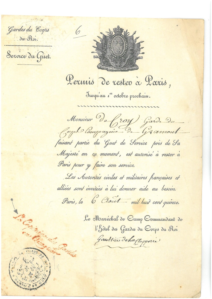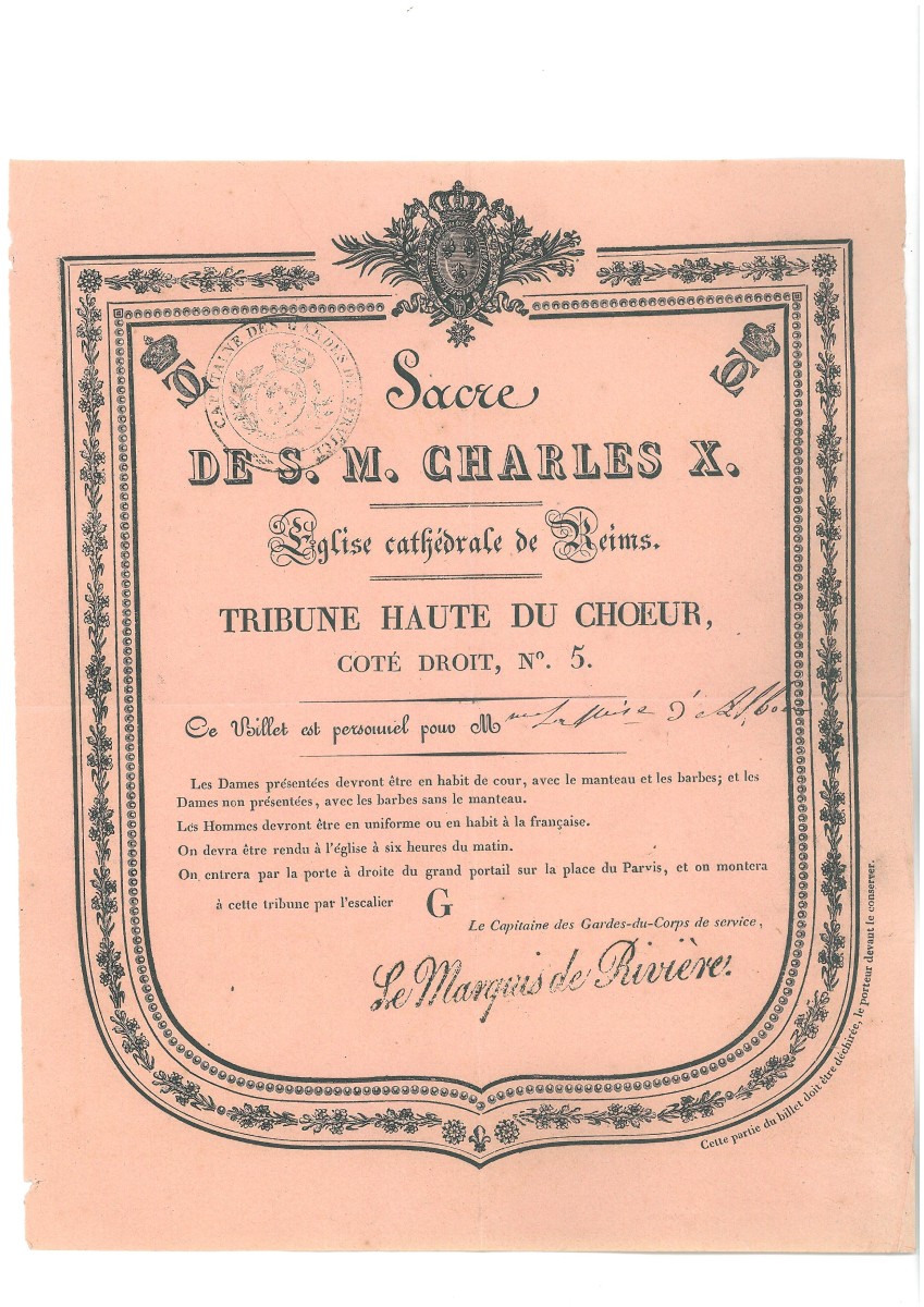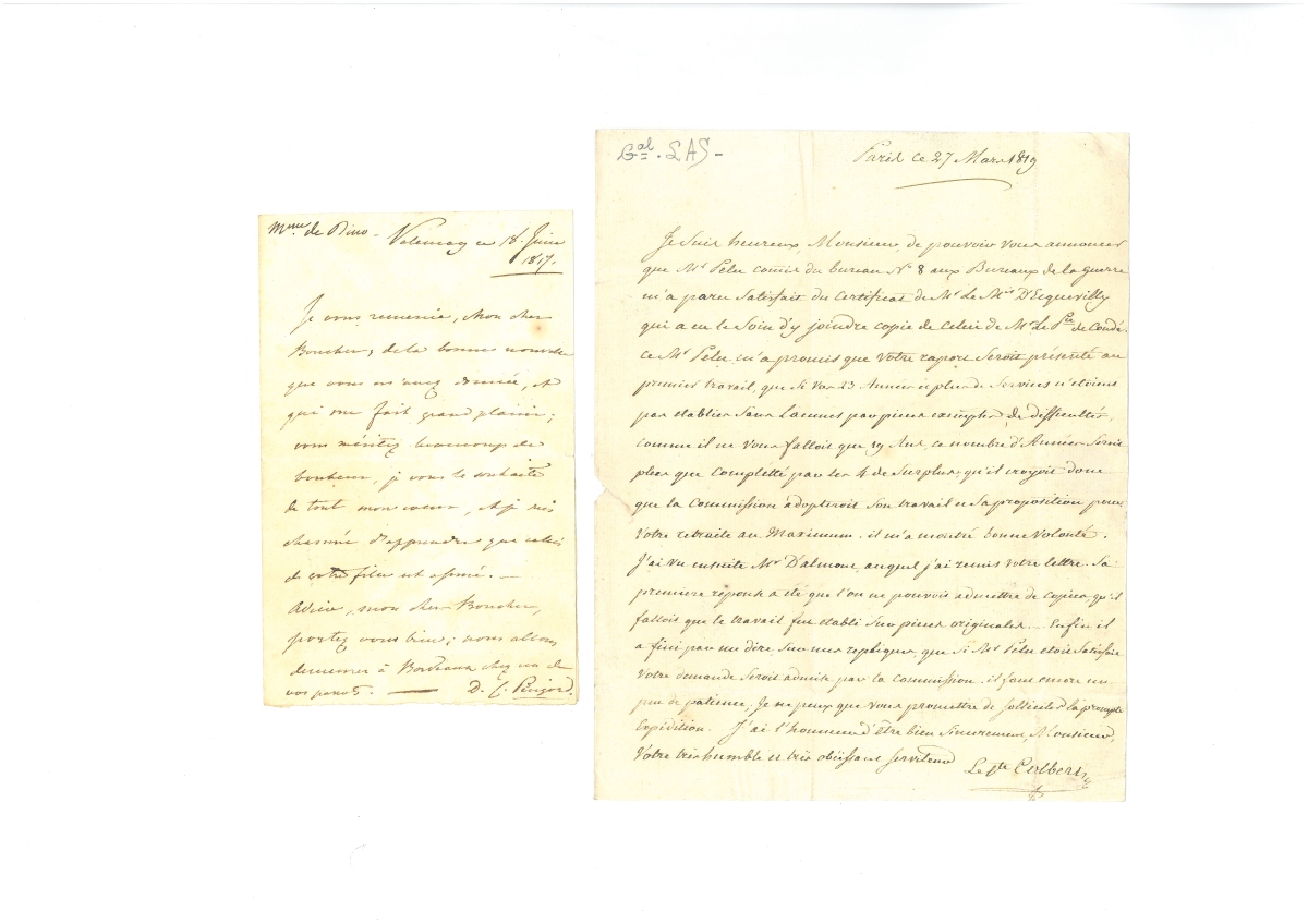 ". - L.A.S. de Dorothée de Courlande (1792-1862), comtesse de Périgord, plus connue sous le nom de duchesse de DINO, nièce et secrétaire intime de Talleyrand, Valençay, 18 juin 1817, 1 page in-12, adressée à Boucher un ami. Tampon de la collection " A. Juncker autog. n°856 ". - P.S. de Prosper de BARANTE (1782-1866), commissaire du gouvernement, Paris, 10 juillet 1817. Brevet de pension sur velin, 41 x 31 cm - P.A.S. de Charles Benoît FAUVRE-LABRUNERIE (1751-1825), député sous la Convention nationale, exilé en Suisse par le gouvernement de Louis XVIII, Constance, 30 avril 1818 - L.A.S. de " Le cardinal de Bausset " [Louis François de BAUSSET (1748-1824), prélat et homme de lettres], Paris, 13 juin 1818, adressée à son neveu. - L.A.S. de Louis Pierre Alphonse comte de COLBERT-CHABANAIS (1776-1843), général, Paris, 27 mars 1819, 1 page in-4. - P.S. par les officiers et sous-officiers de la légion de la Creuse qui délivrent une permission de 3 mois à un grenadier, Belle-Isle en Mer, 1er oct. 1817, beaux cachets encre, 23,5 x 32 cm - L.A.S. de la veuve du général Claude-François de MALET, initiateur de la conspiration contre Napoléon en 1812, [Denise de Balay], Paris, 20 nov. 1820, 3 pages in-8. - L.A.S. de Louise Elisabeth de CROY d'HAVRE (1749-1832), duchesse de Tourzel, dernière gouvernante des enfants de Louis XVI, Paris, 14 oct. 1820, 1 page in-4, adressée à la baronne de Talleyrand, cachet cire rouge aux chiffres. Elle lui demande des renseignements sur une femme épouse d'un bourrelier d'Ivry et fille d'une " Madame Ste Marie nourrice du jeune roi Louis XVII " qui lui dit être criblée de dettes et qu'elle la supplie " d'intéresser en sa faveur Madame duchesse d'Angoulême ". - L.S. du baron Guillaume-Charles ROUSSEAU (1772-1834), général, Le Mans, 10 oct. 1822. Invitation à assister au service anniversaire chanté dans la cathédrale du Mans pour feue la Reine Marie Antoinette. - L.S. de Gilbert Joseph Gaspard CHABROL de VOLVIC (1773-1843), préfet, Paris, 21 sept. 1823 - Rare INVITATION au sacre de Charles X à la cathédrale de Reims, 29 mai 1825, 1 page impr. in-4, cachet encre du capitaine des gardes avec fleurs de lys. - L.A.S. du comte Antoine Guillaume RAMPON (1759-1842), général, Paris, 27 janvier 1826. - L.A.S. de Hudson LOWE (1769-1844), général anglais, geôlier de Napoléon à Sainte-Hélène, Calpesty, 27 février 1827, adressée à Sir Hardinge Giffard, 4 pages in-4 en anglais. Lettre écrite de Ceylan où Lowe commanda les forces anglaises de 1825 à 1830. - Billet de circulation au "Grand Couvert Du Roi A L'Occasion De La Fête De S. M. Le 4 Novembre 1828.", tampon " Per gentilhomme de la Chambre du roi ", 9,5 x 13 cm. - P.S. par les officiers du 54e régiment d'infanterie de ligne lors de l'expédition de Morée, certificat provisoire de libération délivré à un grenadier, Patras, 11 janvier 1829 - L.A.S. de Philippe BUONARROTI (1761-1837), révolutionnaire italien, ami et partisan de Gracchus Babeuf, Bruxelles, 3 février 1829, 1 page in-8, adressée à Mme Teussot à Liège. Il annonce à son amie son départ pour la France, avec sa mère et son mari, Barrère et Francinetti. - L.A.S. de Jacques Claude comte janvier BEUGNOT (1761-1835), pair de France, 31 mars 1830, 1 page in-8 -