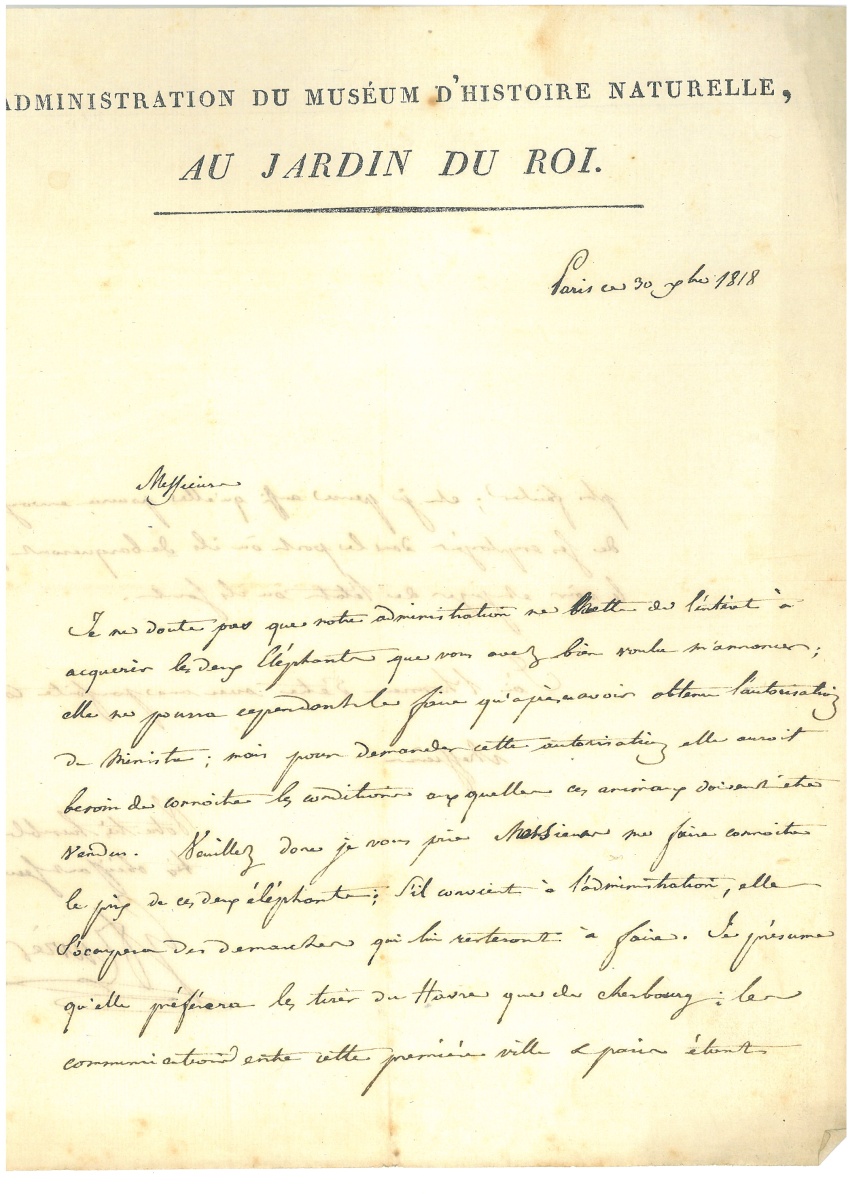 " Messieurs, je ne doute pas que votre administration ne mette de l'intérêt à acquérir les deux éléphants que vous avez bien voulu m'annoncer ; elle ne pourra cependant le faire qu'après avoir obtenu l'autorisation du ministre ; mais pour demander cette autorisation elle aurait besoin de connaître les conditions auxquelles ces animaux doivent être vendus. Veuillez donc je vous prie messieurs me faire connaître le prix de ces deux éléphants ; s'il convient à l'administration, elle s'occupera des démarches qui lui resteront à faire. Je présume qu'elle préférera les tirer du Havre que de Cherbourg ; les communications entre cette première ville et Paris étant plus faciles ; et je pense aussi qu'elle pourra envoyer un de ses employés dans le port où ils débarqueront pour les voir et juger de l'état où ils sont