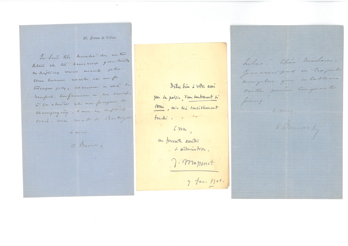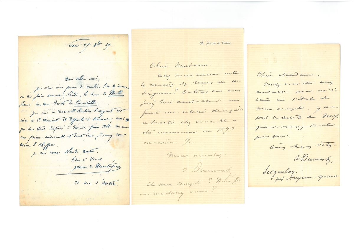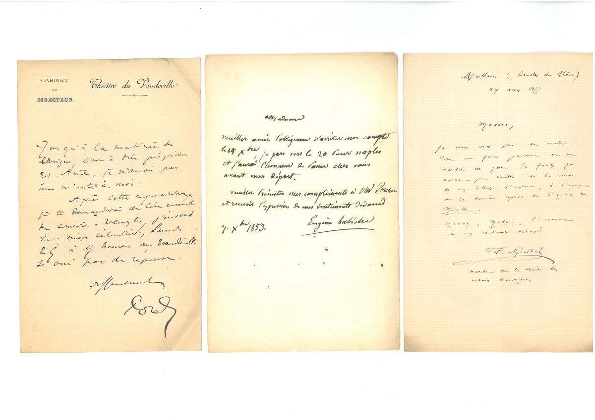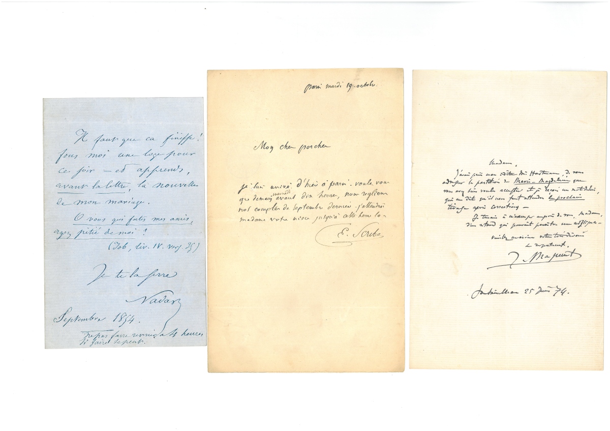 Env. 40 L.A.S. et L.S. dont Paul POREL (5 L.A.S.) - Alexandre DUMAS fils (5 L.A.S.) - Eugène LABICHE (1) - Frédéric MISTRAL (1) - Xavier de MONTEPIN (2) - André ANTOINE (1) - Ernest LEGOUVÉ (1) - NADAR (1) - comte de NIEUWERKERKE (1) - REJANE (1) - Ernest COQUELIN (1) - Henri MURGER (1) - Pierre DECOURCELLE (1) - VERTEUIL (1) - Eugène SCRIBE (1) - Théodore BARRIERE (1) - Jules MASSENET (2) - François GERARD dit baron Gérard (1) - Luigi GORDIGIANI (1) - Friedrich KALKBRENNER (1) - Adrien-François SERVAIS (1) - Benjamin CONSTANT (1) - Joseph PONIATOWSKI (1) - etc.