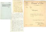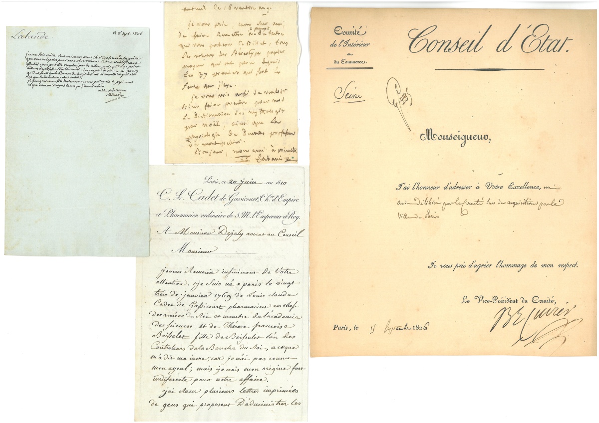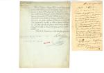 " [Officiellement, il est le fils de Louis-Claude Cadet de Gassicourt et de Françoise Boisselet. Cependant, dans ses Mémoires, son ami le baron Thiébault prétend qu'il est le fruit des amours de Louis XV et de Françoise Boisselet.] - P.A.S. d'Alexandre Urbain baron d'YVAN (1765-1839), chirurgien de Napoléon Ier, et signatures des officiers de santé en chef PRIVAT, ROBILLIARD et SABATIER, Invalides, 30 juin 1810, ½ pages in-4, en-tête " Hôtel Impérial des Militaires invalides ". Certificat pour un soldat ayant perdu la vue. - Diplôme d'associé à la société d'instruction médicale, école de médecine de Paris, 4 mai 1812, signatures des administrateurs et cachet encre de la société, 1 page in-fol. - L.A.S. d'Antoine Marie PEYRE (1770-1843), architecte, 20 août 1815, 1 page in-4, à son en-tête: " (